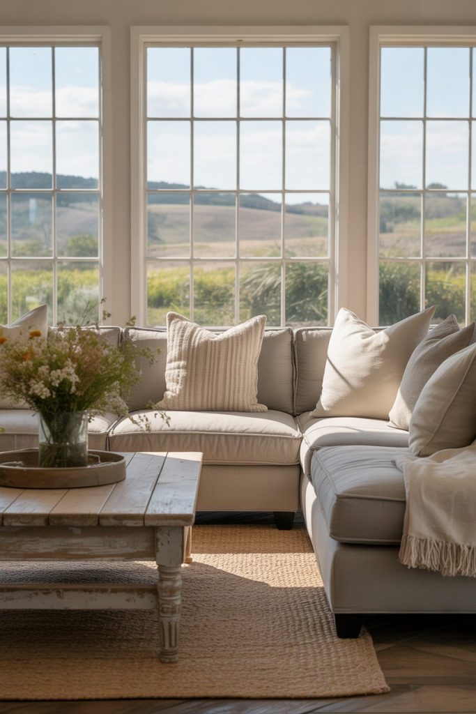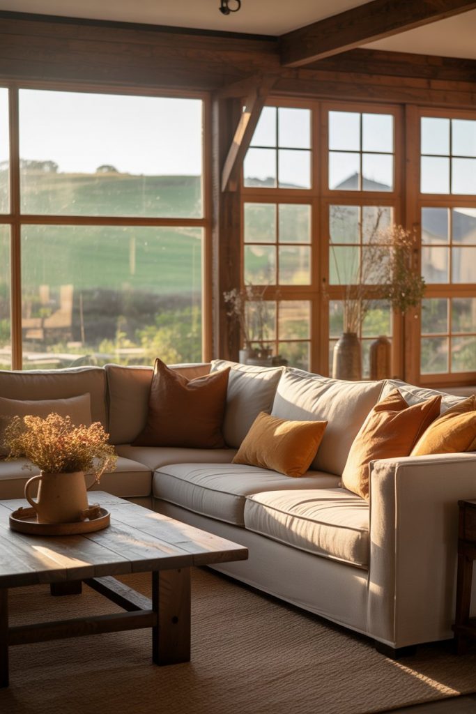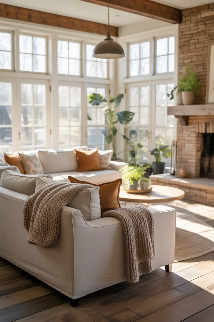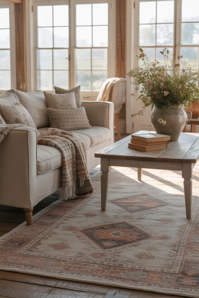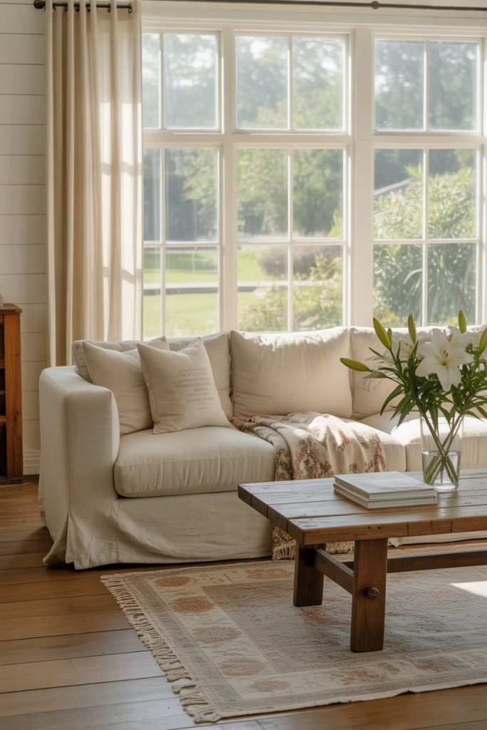 An open layout invites light and conversation. Blending kitchen and living areas captures modern living while keeping the cozy farmhouse heart. Use rugs to define zones while maintaining visual flow.