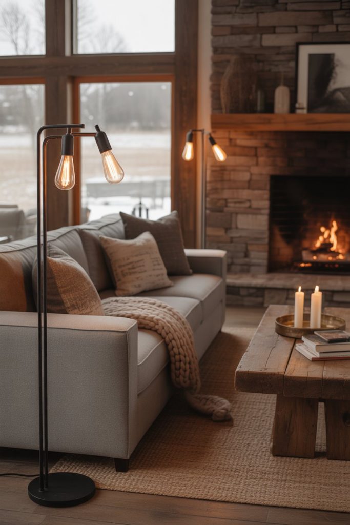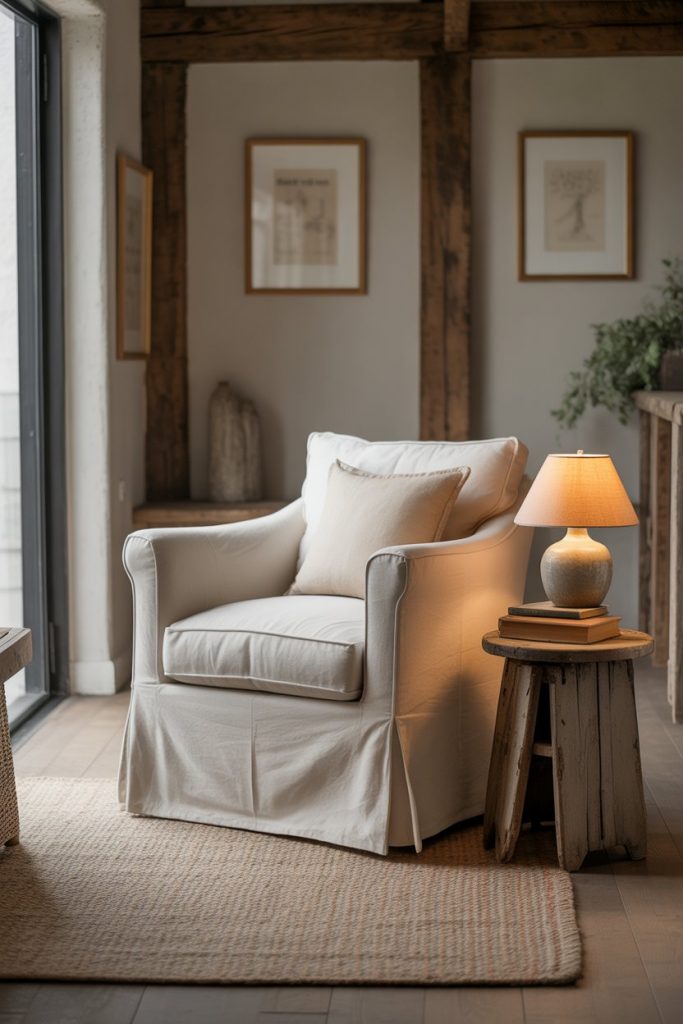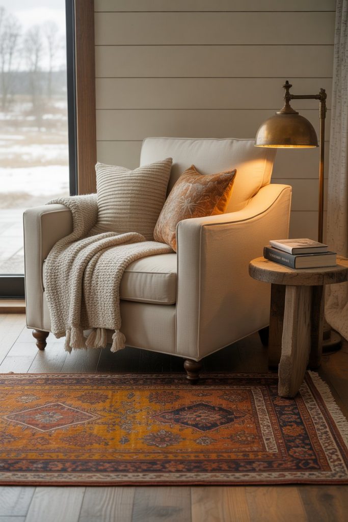 Build a warm reading nook beside the window using a small armchair, a lamp, and a soft blanket. This cozy setup turns overlooked corners into well-loved retreats. Accompany it with a rug and wooden shelves for a bit of extra charm.