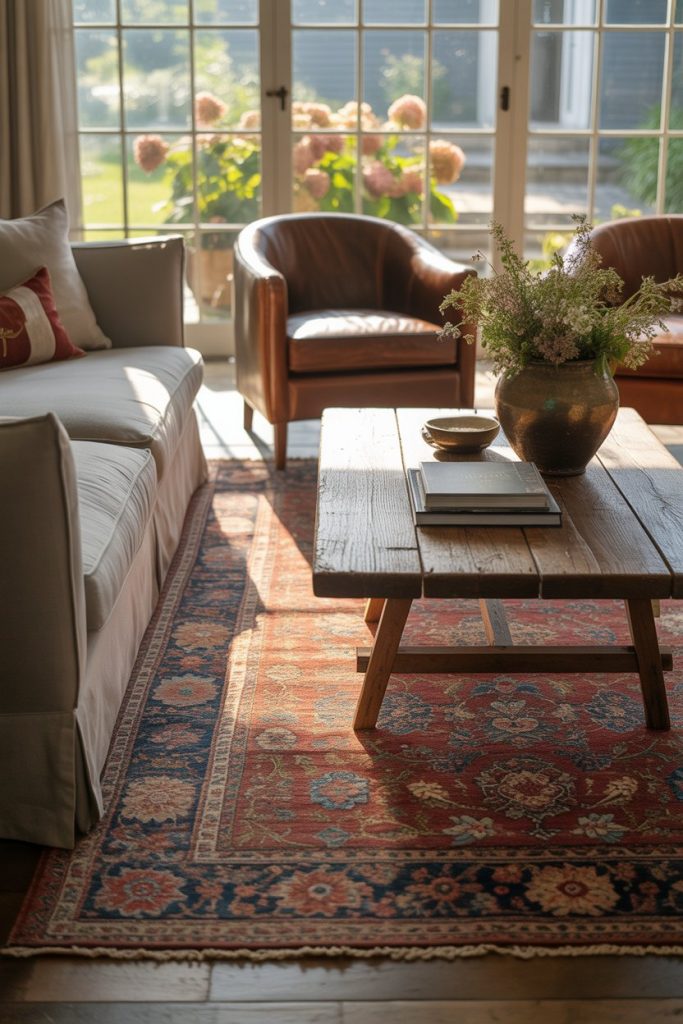 Vintage style rugs serve to anchor the arrangement of furniture while providing texture. Aim for handwoven or faded designs that tell a story. This brief element in your decor can turn the vibe of a room upside down and make every color color-talk.