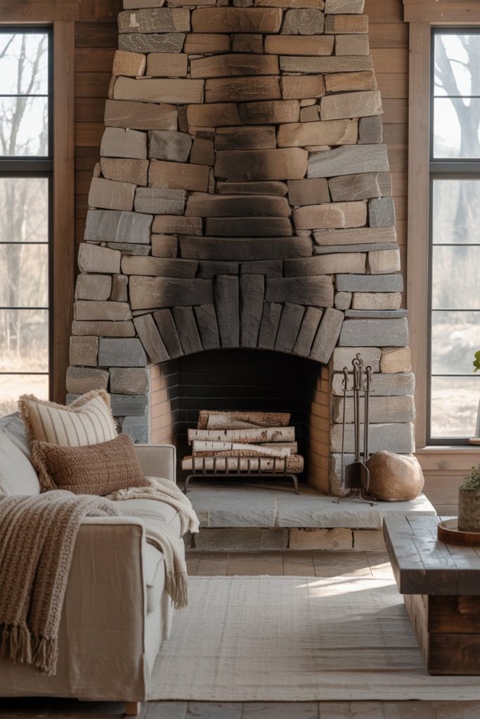 A bold fireplaces design anchors any modern farmhouse living room. Opting for stone, brick, or shiplap will set the focal point of your home. Soft seating and layered rugs will complement this setup to ramp up homey farmhouse storytelling.