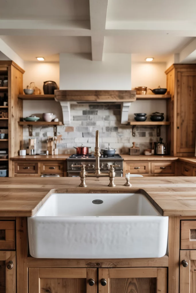 The new farmhouse look trades stark shiplap for muted clay, sage, and caramel tones. Instead of mass-produced décor, people are choosing handmade pottery and reclaimed wood shelves. I saw this in a suburban remodel where the owner kept her grandma’s oak table but paired it with matte black fixtures, creating a space that felt both inherited and fresh. This version of farmhouse is less “barn cosplay” and more soulful country comfort with modern durability.