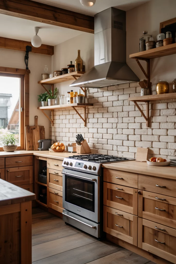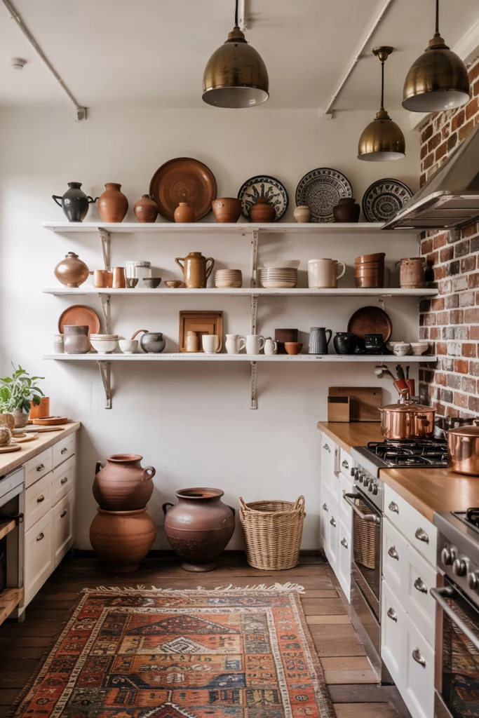 A boho kitchen celebrates layered ceramics, mixed metals, and travel souvenirs on floating shelves. It’s not messy—just intentionally eclectic. I once cooked in a friend’s boho space where every bowl had a story, from Morocco to Mexico. The room felt like a passport. Perfect for creative homeowners who don’t want their kitchen to look “staged.”