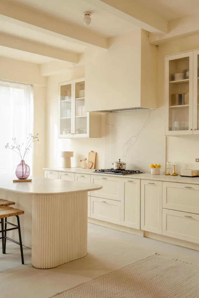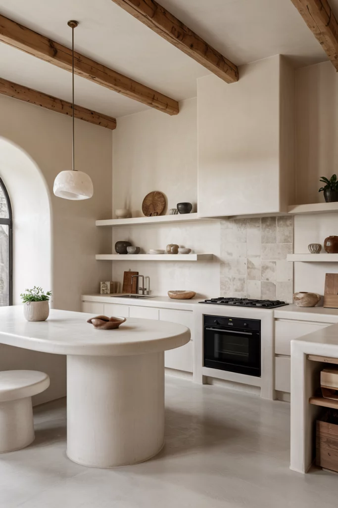 The final idea combines organic forms, clay-toned walls, and soft, rounded edges for a kitchen that is calming, relaxing, and almost spa-like. “Earth hug” design is what Pinterest refers to, and this kitchen does feel as such. A designer friend made a curved plaster island, which was sculpted and not built. All guests felt the need to touch it and appreciate it as a sculptural piece of art. This is ideal for those who lean to softer looks and melancholies.