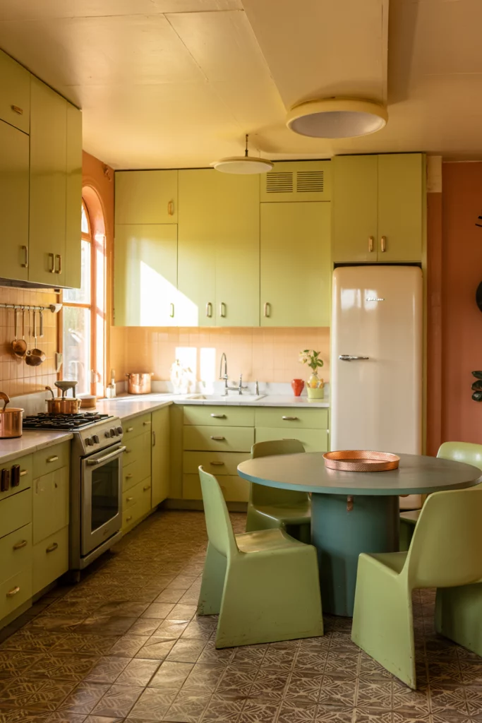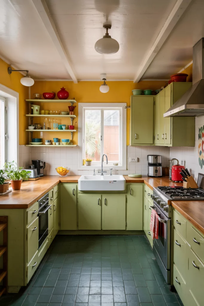 The colorful mid-century wave brings back avocado green, saffron yellow, and atomic blue—but with today’s eco-friendly finishes. A friend restored her 1964 ranch kitchen and kept the original tile color, then added an induction cooktop and LED strip lighting. The result felt optimistic without being kitschy. This is for homeowners who crave cheerful palettes and aren’t afraid of a little nostalgia.