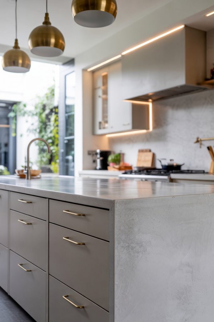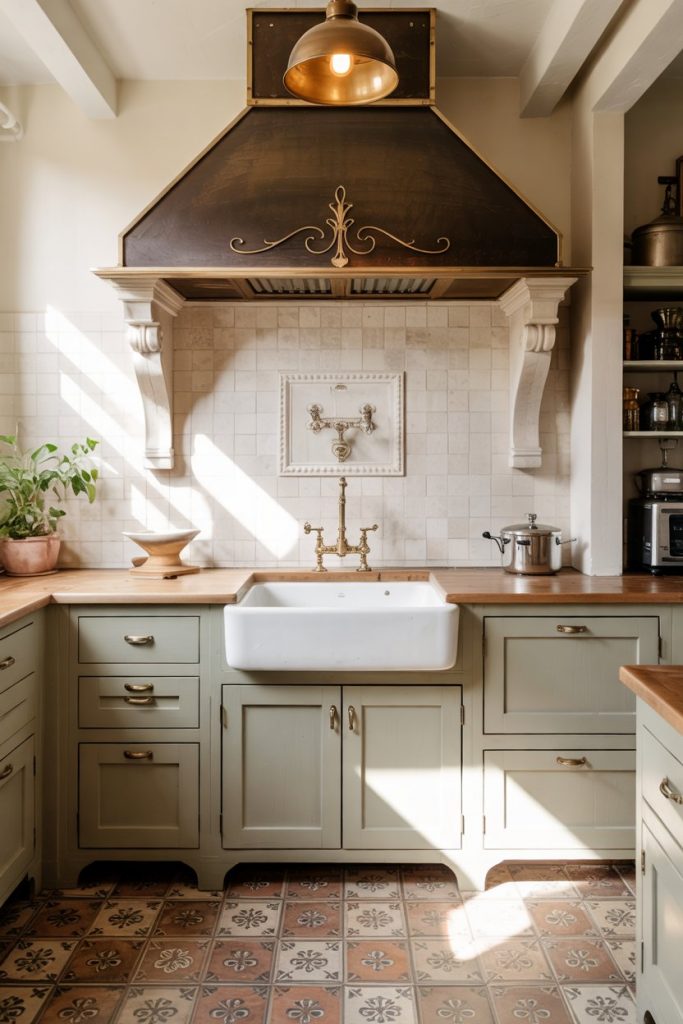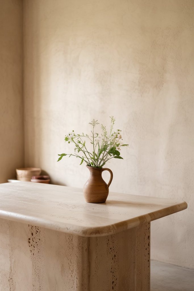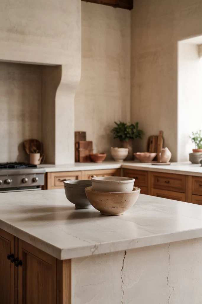 The earthy kitchen trend replaces glossy quartz with travertine, tumbled limestone, and adobe-tinted plaster. These surfaces age beautifully, gaining patina instead of wear. I watched a designer rub olive oil into a limestone counter to deepen the tone—it looked like art, not maintenance. This idea works for people who love tactile, nature-grounded interiors.