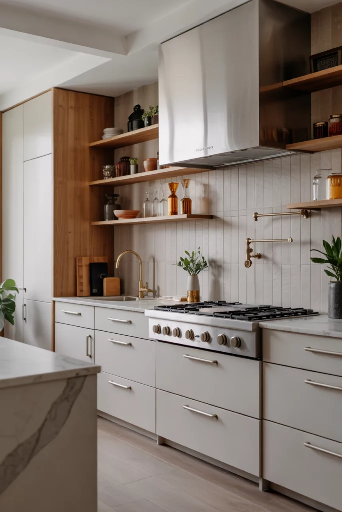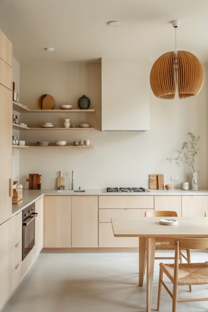 If your kitchen feels chaotic, a Simple Scandinavian approach can reset the mood: pale wood, hidden handles, and one meaningful pendant light… The open space and lack of visual noise invite slower living. It’s ideal for people who want beauty but don’t want to dust shelves full of décor.