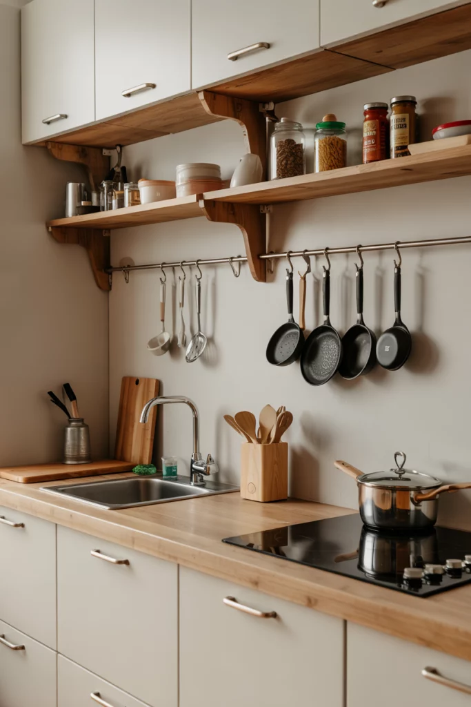 For renters and tidy cooks, a minimalist rail system keeps everything reachable—pans, spices, towels—without drilling dozens of shelves. I installed one for a client who said it “saved five steps per recipe.” The look stays clean, the workflow is faster, and nothing feels over-decorated.