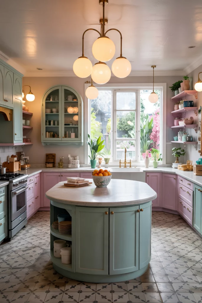 Influenced by digital home-building games, the Bloxburg style brings bold symmetry, cube-shaped islands, and playful pastels into real kitchens. Young homeowners love how it feels both structured and fun, almost like designing a layout in a game but upgrading it with marble, metal, and smart storage. I saw this in a small apartment where the geometric layout made the kitchen feel organized instead of tight. It’s a creative way to turn limited space into something joyful.