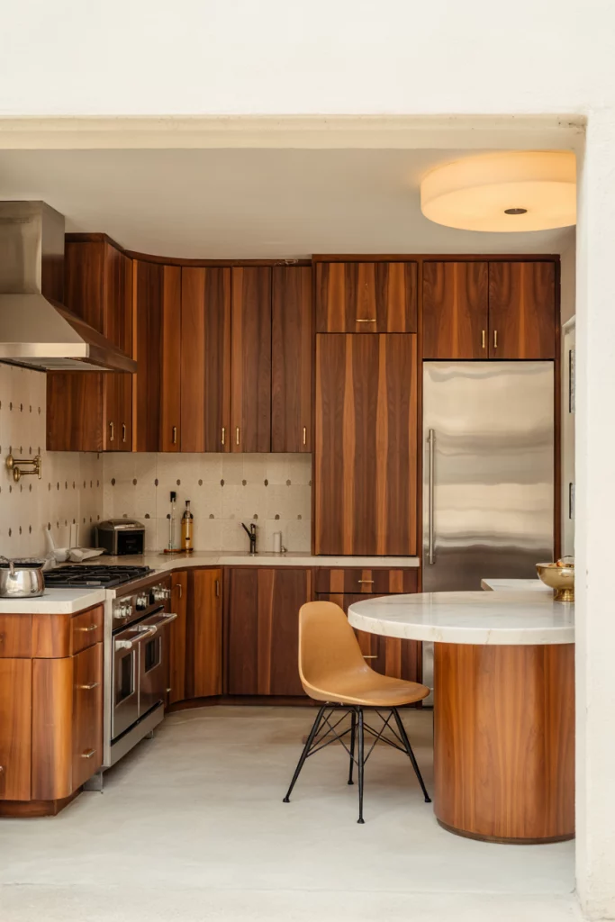 Mid-century design is continuously appreciated for its warm and inviting features, softened contours, walnut tones, and tapered legs. It is also very nostalgic since it was enhanced with brushed bronze or stainless steel. I had the chance to visit a home where a walnut island with curved corners met a sleek metal hood, like a 1960s home that got a tech upgrade. It’s ideal for people who enjoy retro silhouettes but want modern performance.