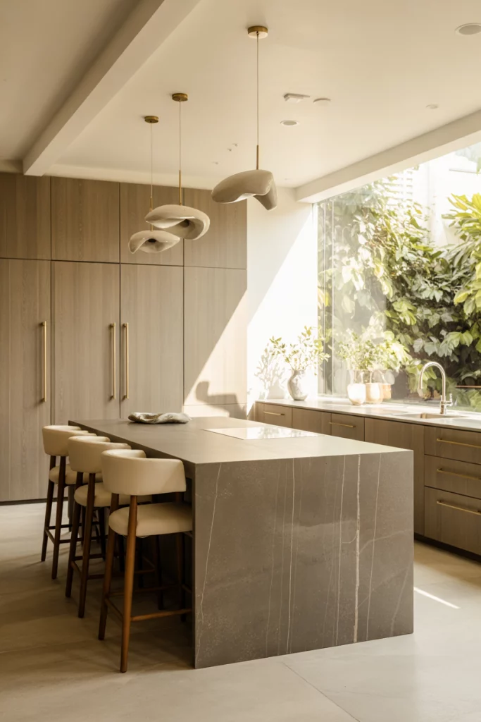 Nothing says 2026 like a dramatic stone island with waterfall edges, hidden outlets, and pendants that look like sculptures. This is luxury without the fuss—smooth surfaces, integrated storage, and hospitality-level lighting.