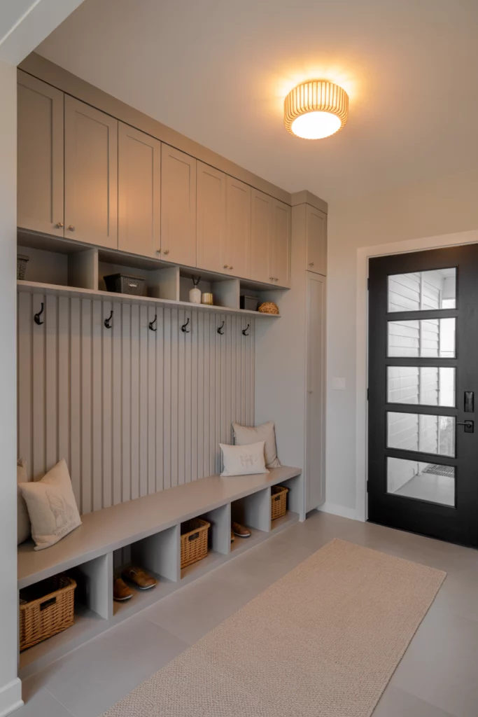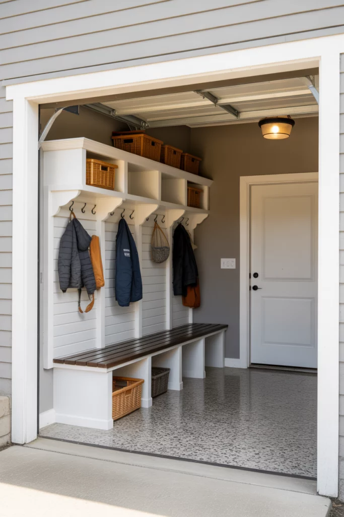 A garage entry mudroom is ideal for households constantly moving between the garage and the main living areas. This setup captures shoes, sports gear, and bags before they enter the home. Homeowners love sturdy flooring, wall-mounted storage, and a quick-grab bench—details experts like those at Houzz highlight for practical workflows in active homes.