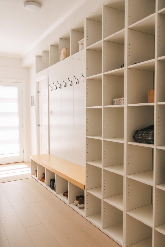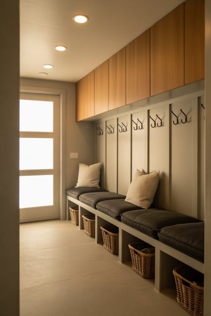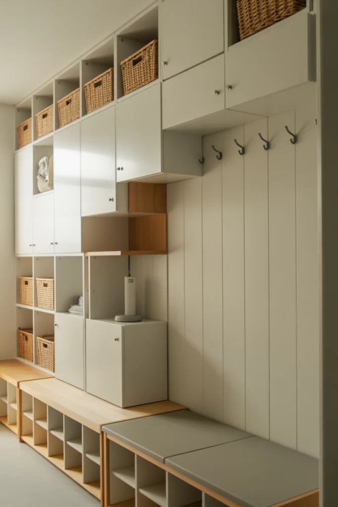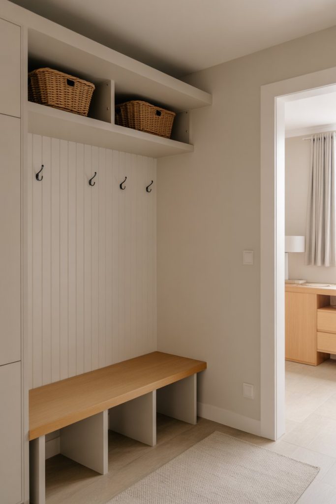 A simple entry-style mudroom focuses on clean surfaces, uncluttered walls, and a small set of well-chosen tools—hooks, a bench, and hidden storage. This idea resonates with homeowners embracing slower living or wanting stress-free transitions. The minimalist look keeps daily routines calm and intentional.