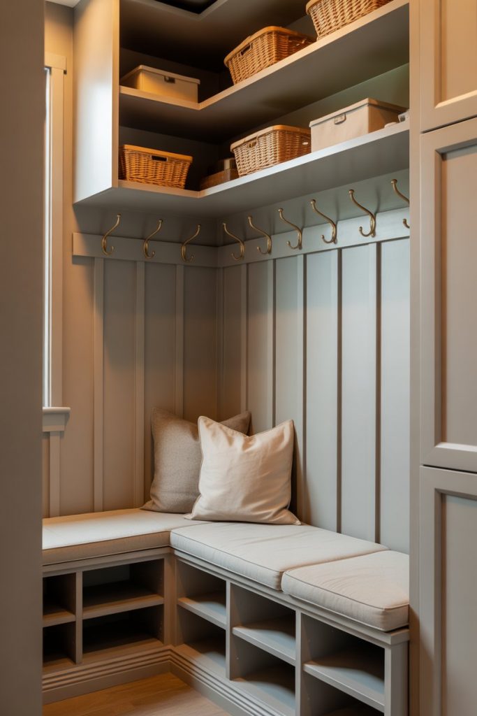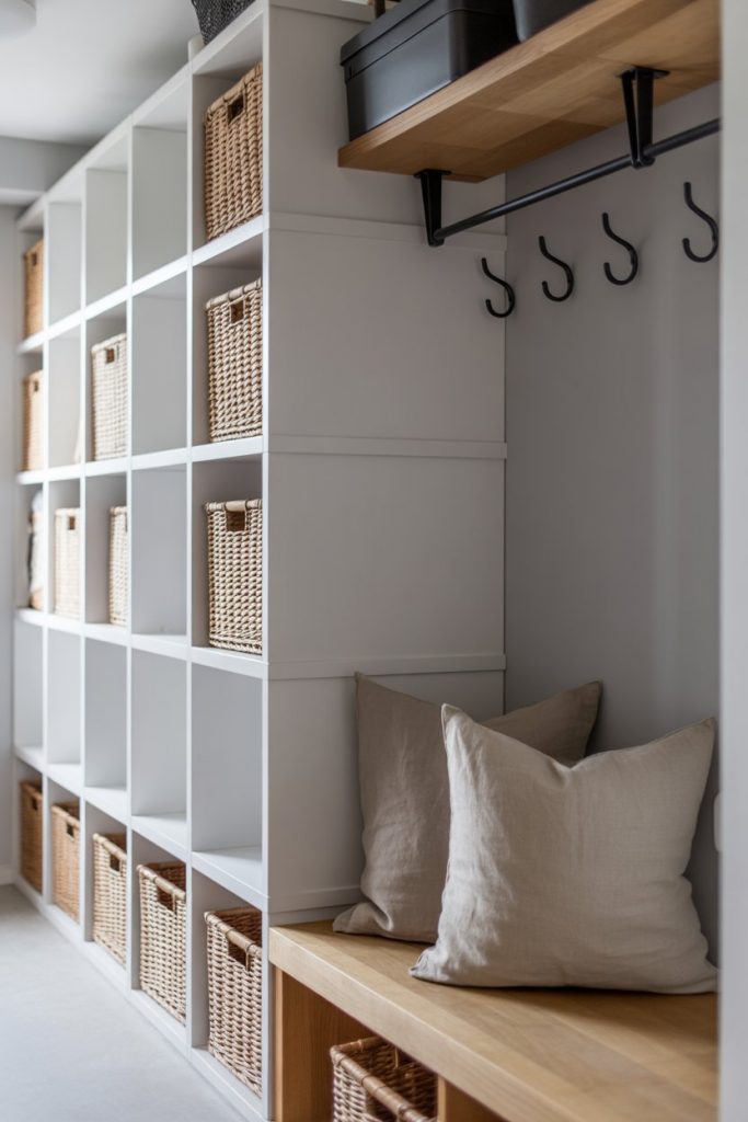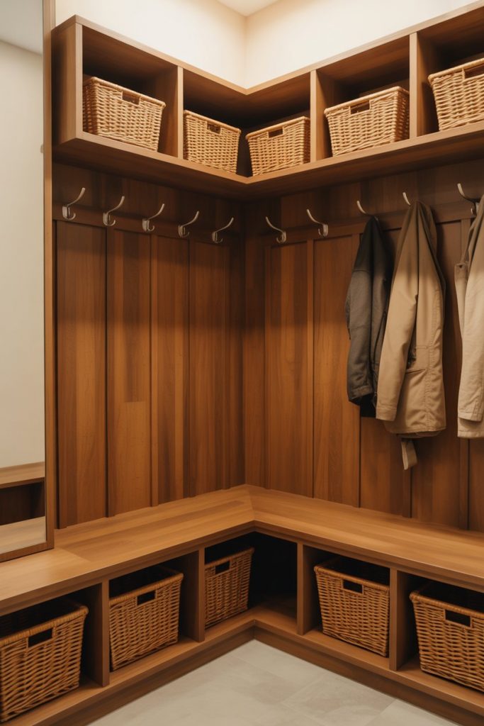 A corner or small corner mudroom maximizes awkward spaces by turning unused nooks into efficient storage. This idea is perfect for tiny apartments or narrow layouts where a full mudroom isn’t possible. Designers often use floating shelves, corner benches, and vertical organization to make the area feel intentional rather than cramped.