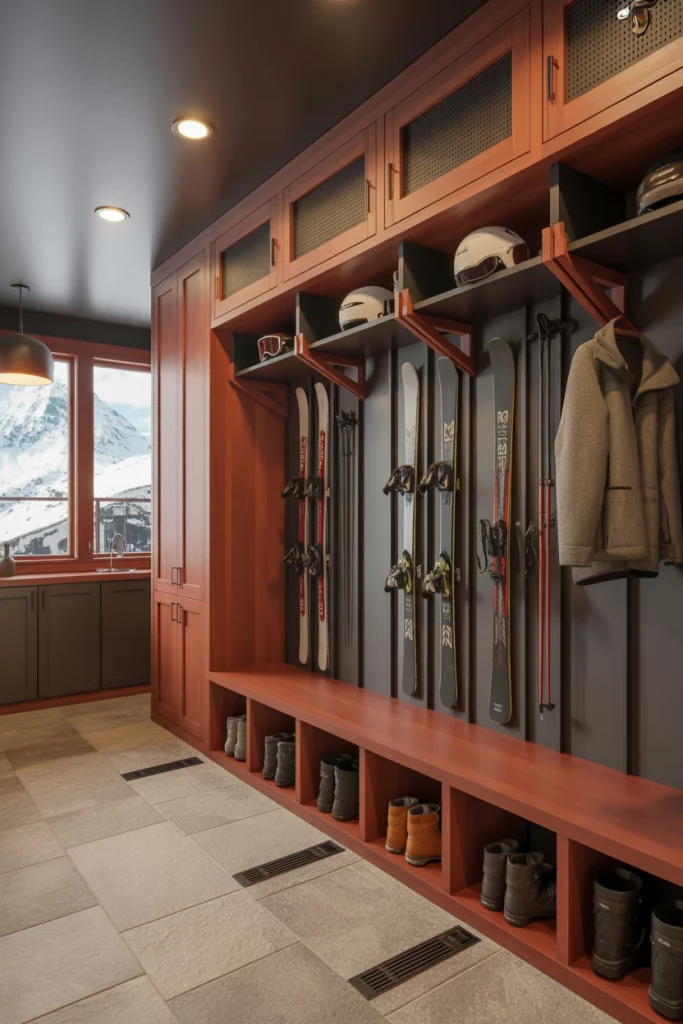 A ski-themed mudroom works for ski-loving families who need an area for bulky sport gear storage. Moisture-tending boot dryers, wall racks, and ventilated cabinets keep the entry easy to maintain and organized. This ski sport mudroom is best for mountain houses or suburban homes near a ski resort. It also works for families who travel regularly and need ready-to-grab sports gear.