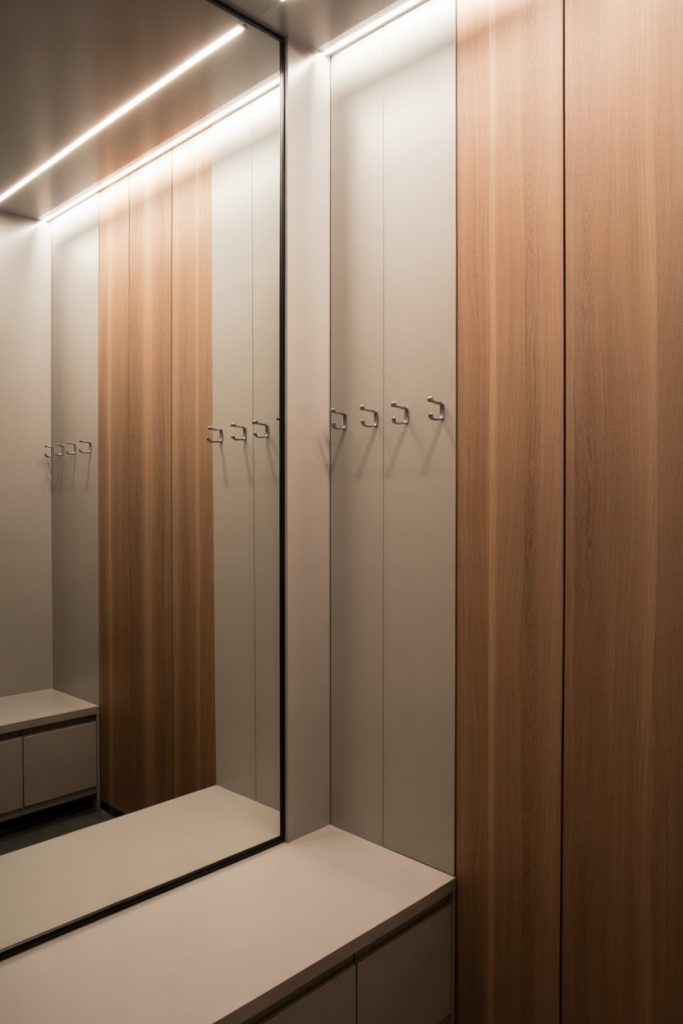 A narrow mudroom benefits from tall cabinets, slim benches, and vertical hooks that turn limited width into efficient organization. This idea is ideal for older homes or apartments where hallways serve as the main entry. Designers often add mirrors or sconces to visually open the space without sacrificing storage.