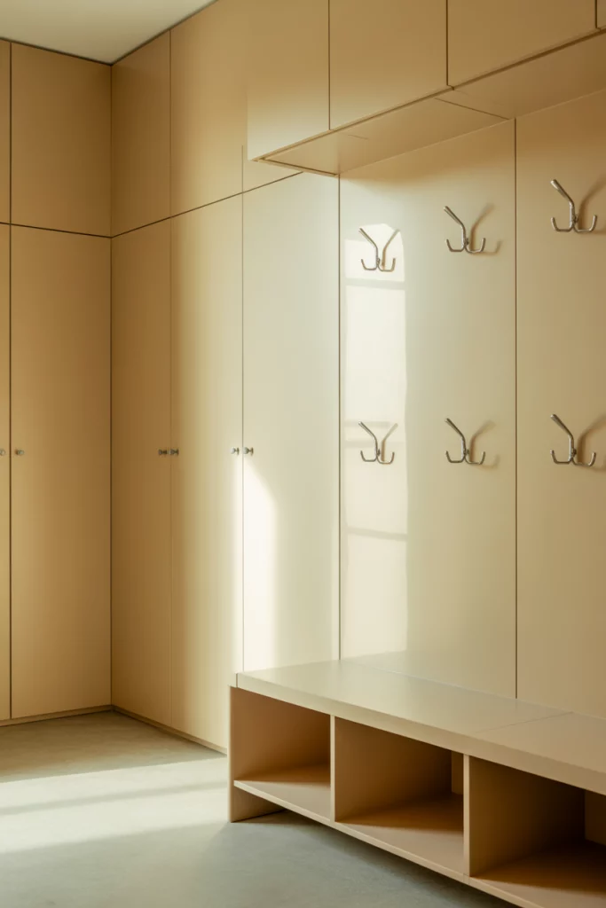A large mudroom with a wall of lockers is ideal for busy families juggling school, hobbies, and work. Individual cubbies labeled for each person keep daily life running smoother—a method often recommended by professional organizers. Hooks, drawers, and tall cabinets help maintain order even on hectic days.