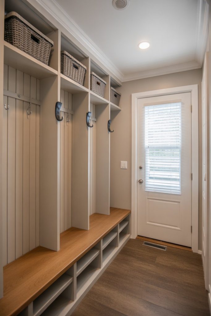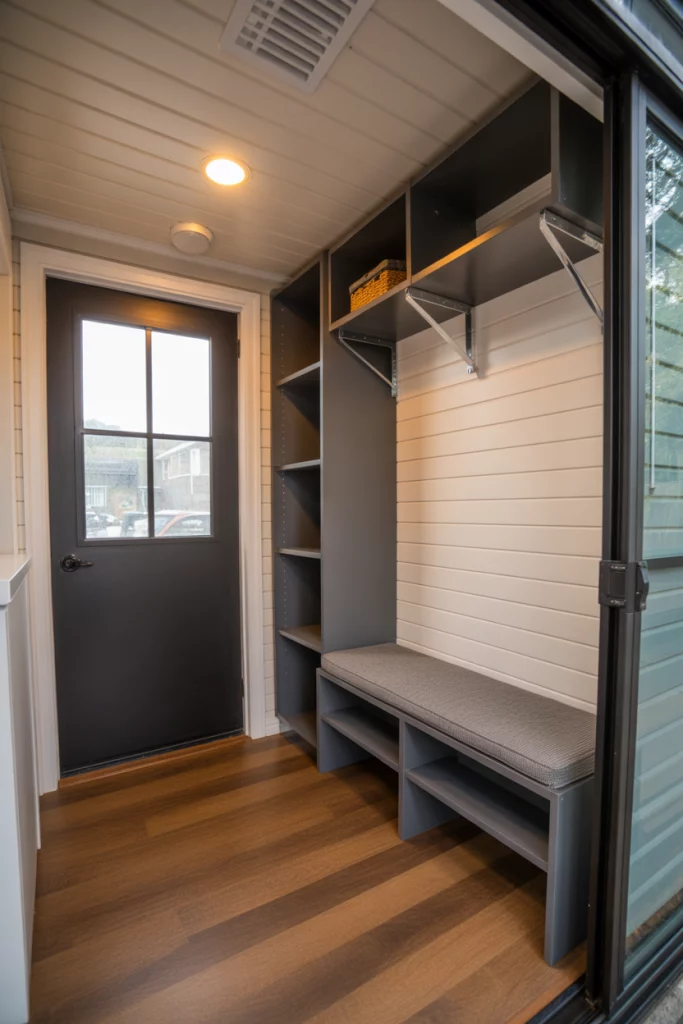 A tiny home mudroom doubles as a transition zone, laundry nook, and storage hub. Compact shelves, sliding doors, and fold-away seating help conserve space. This idea works for small houses, mobile homes, or accessory dwelling units where every area must multitask but still look thoughtfully arranged.