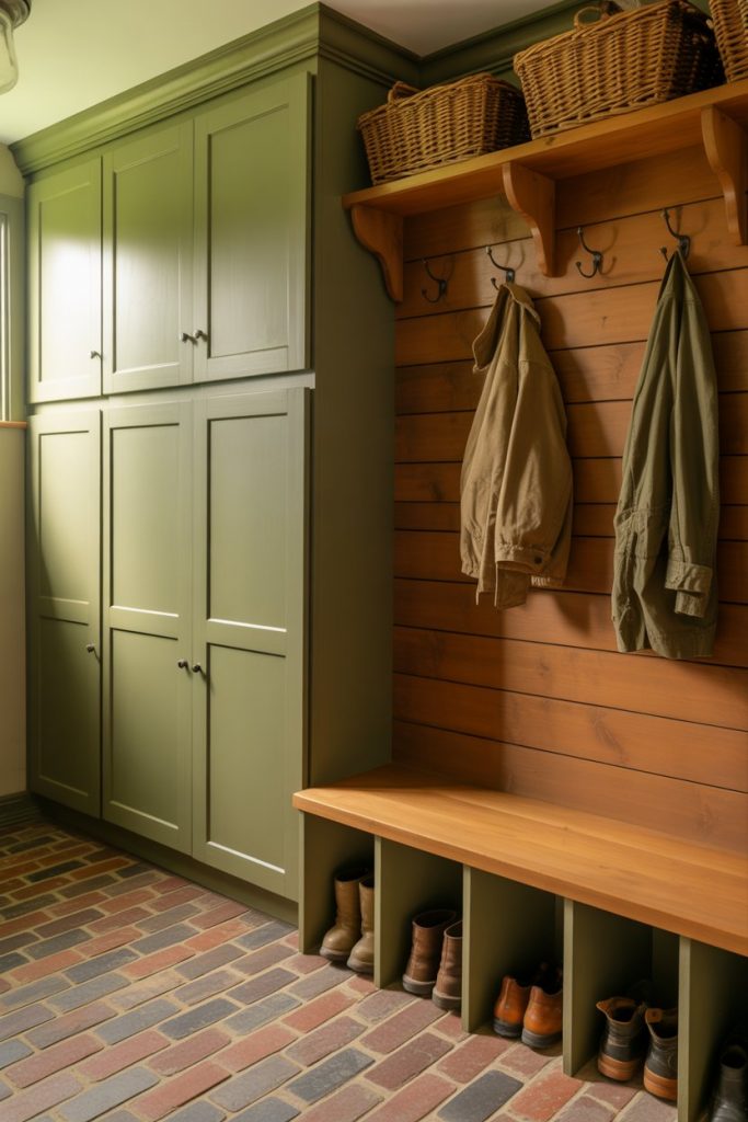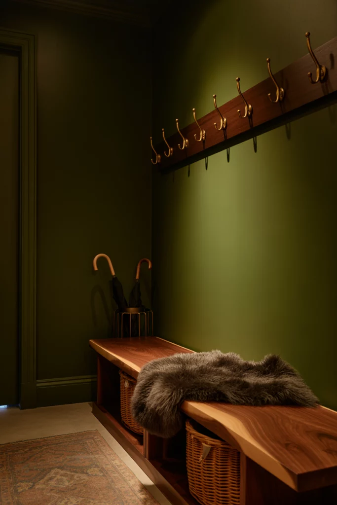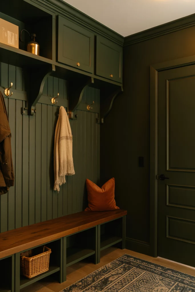 A moody green mudroom has the ability to use darker paint tones to create a moody but welcoming atmosphere. Dark olive or dark forest green paint colors combine well with brass and wood accents. Home owners wanting to add a personality to a space without a lot of things appreciate how the use of color can set the atmosphere in a small space.