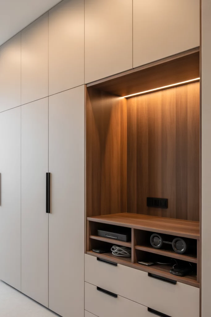 Integrated entryway cabinets with built-in charging drawers solve the modern problem of device clutter. It can be especially beneficial to busy households where phones, tablets, and earbuds need homes. Organized soft-close drawers and labeled stations to keep everything all together and to reduce the chaos on the countertop.