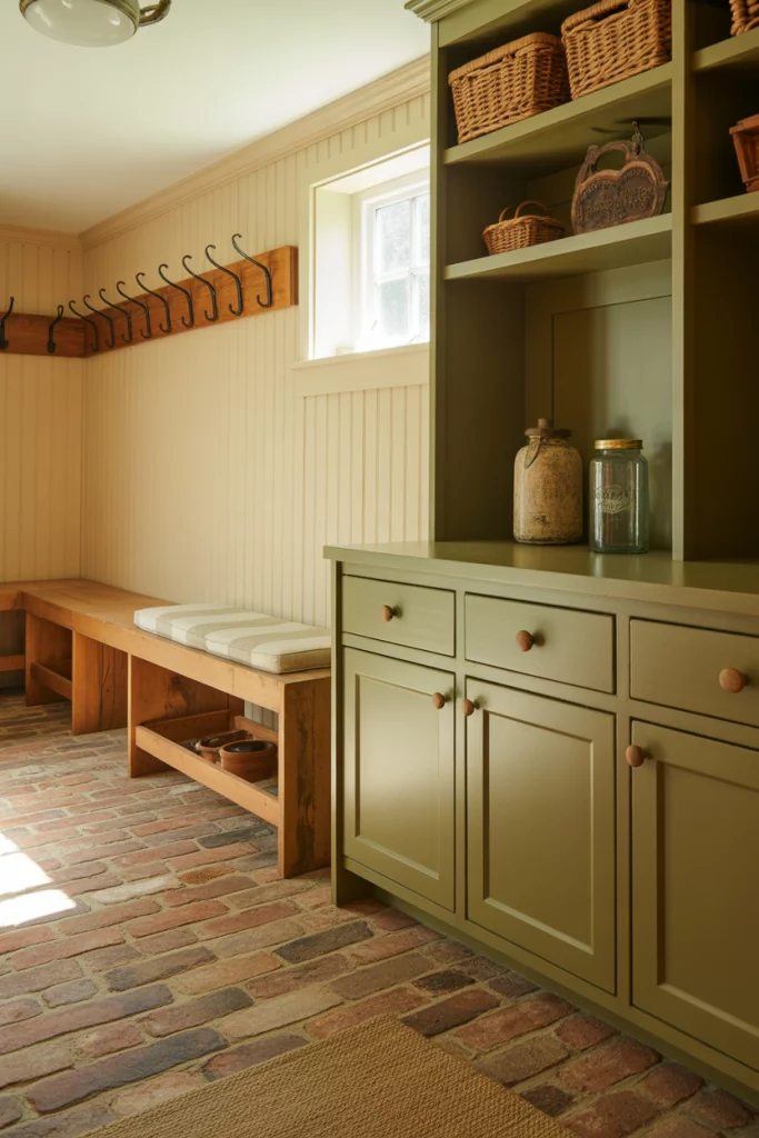 A rustic mudroom with brick or stone flooring brings durability and lays on the charm, especially in the regions with muddy seasons. Paired with simple wooden hooks and shaker cabinetry, it reflects timeless Americana style. This setup thrives in homes that want to achieve character and practicality in equal measure.