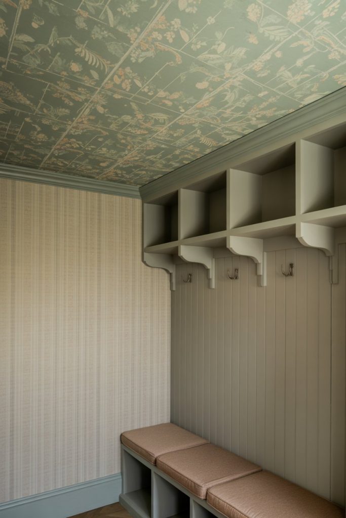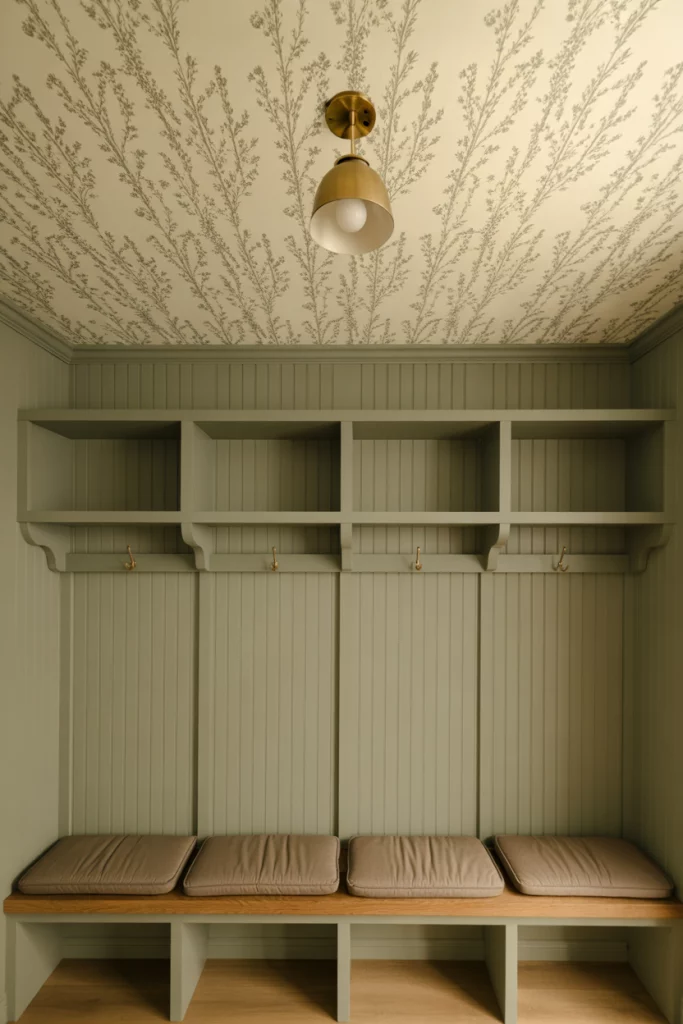 Using wallpaper on the ceiling adds unexpected personality without overwhelming the mudroom. This is especially effective in small or shaped rooms that need visual lift. Designers suggest pairing patterned ceilings with calm wall colors to keep the layout balanced but creative.