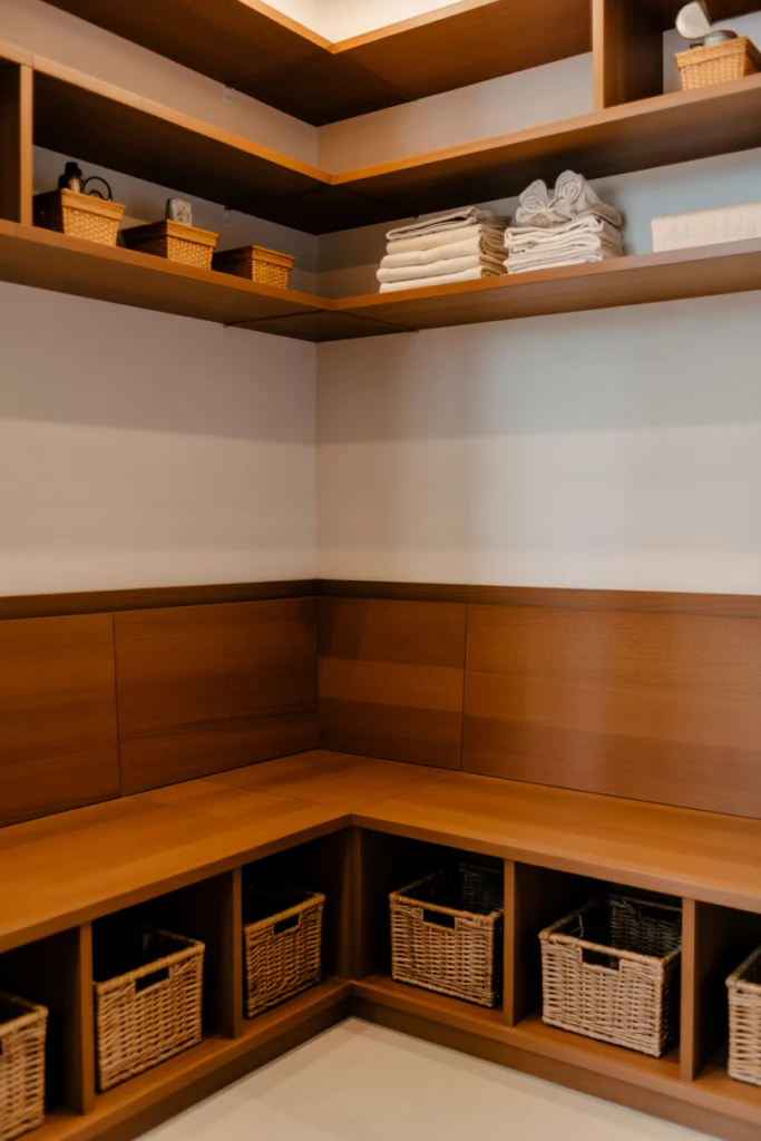 A shaped bench designed for angled or irregular corners helps maximize tricky architectural spaces. This idea works well in older homes or remodels where structural quirks can’t be changed. Custom seating paired with baskets or drawers adds beauty and function.