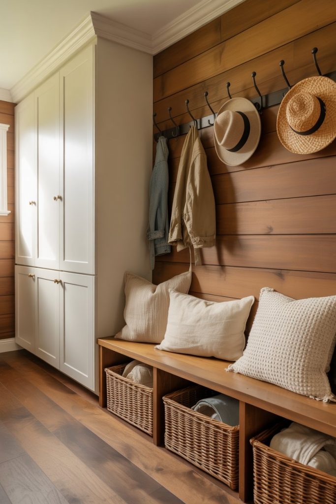 A farmhouse or rustic mudroom brings warmth and personality into daily routines. Think natural wood, shaker cabinets, and textures that feel lived-in but curated. This style works beautifully for families who want a welcoming vibe that still hides mess behind simple, functional cabinetry—a balance farmhouse-inspired creators like Liz Marie Galvan often talk about.