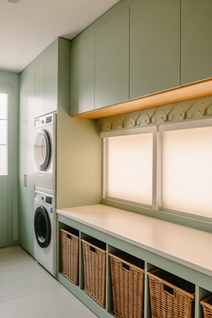A combined entryway laundry or laundry room mudroom supports modern living by keeping sorting, washing, and storage in one place. This idea fits perfectly in homes where space has to multitask and where convenience matters just as much as aesthetics. Adding counters, pull-out hampers, and tall cabinets creates order and flow in daily laundry routines.