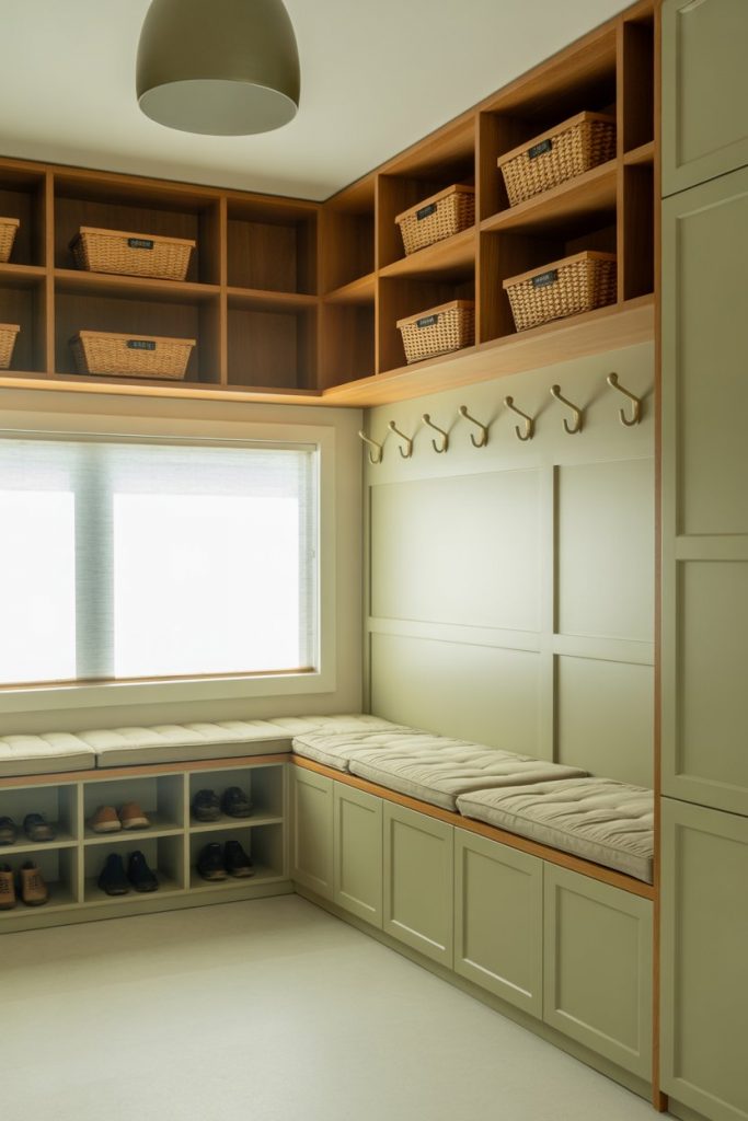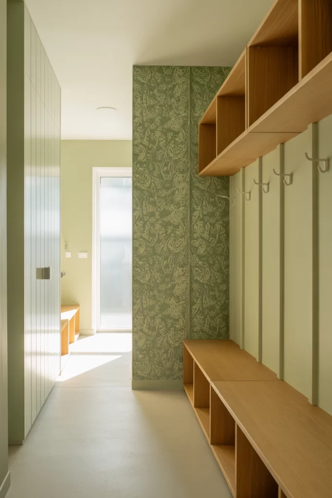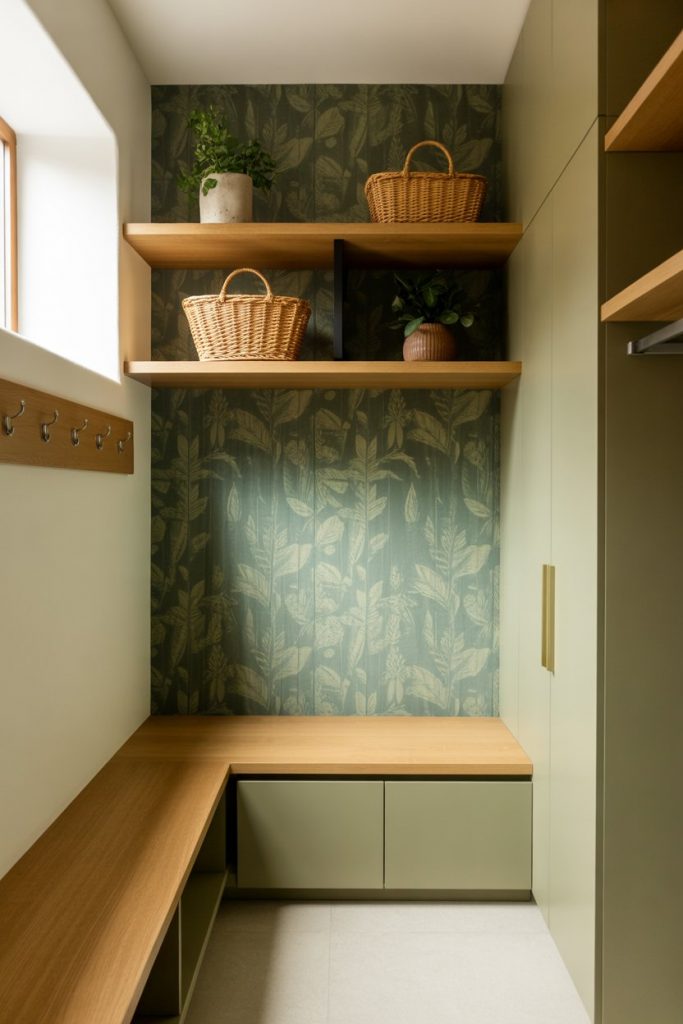 Introducing green or patterned wallpaper instantly elevates a mudroom without requiring major renovation. It adds personality, guides the color scheme, and makes even a narrow mudroom feel styled. Designers often pair wallpaper with simple shelving or cubbies to keep visual order while still expressing creativity.