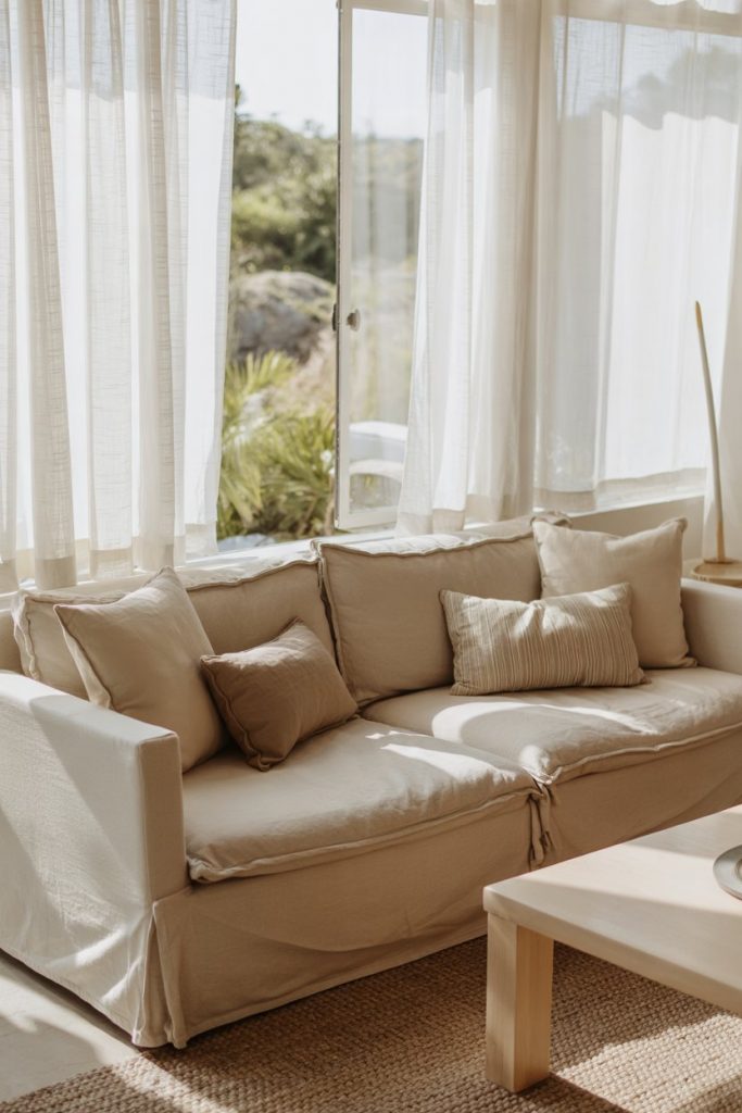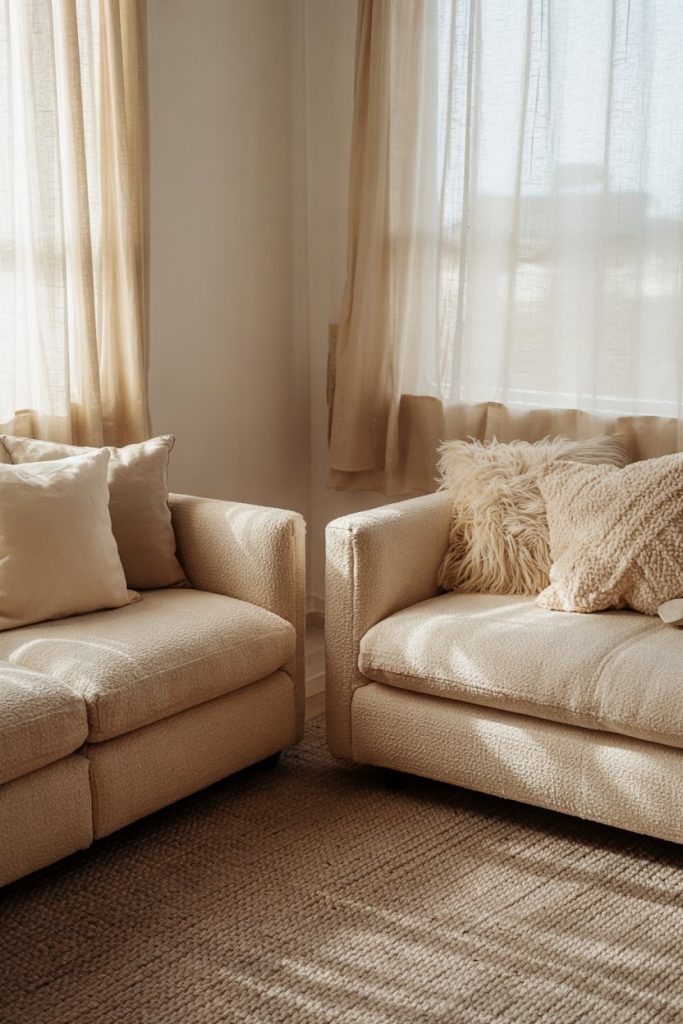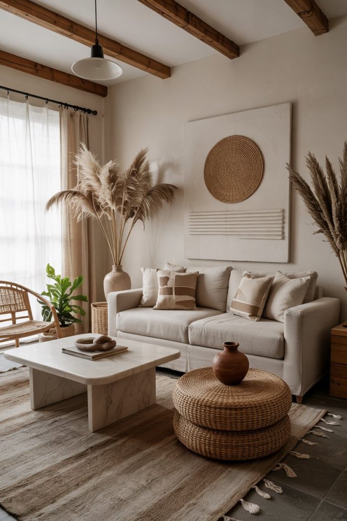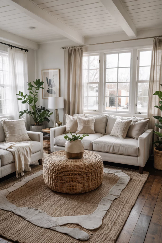 Depth comes from texture, not color. Combine linen, boucle, and jute for tactile inspiration. A woven rug, fringed pillows, and cotton curtains make the space cozy yet sophisticated—proof that adding color isn’t always necessary for warmth.