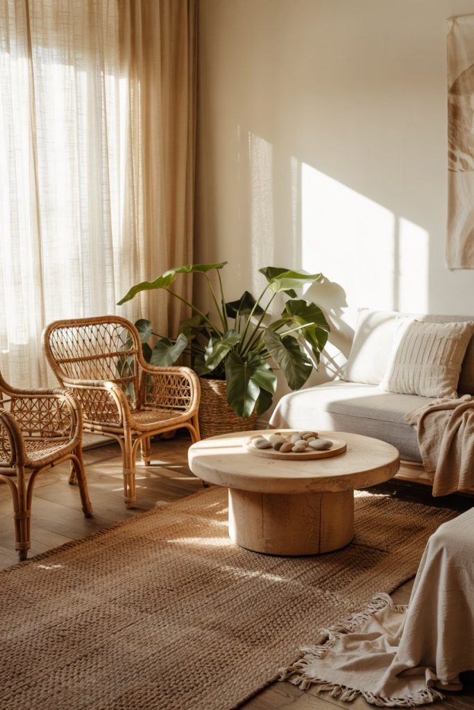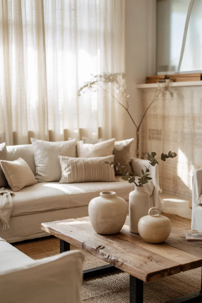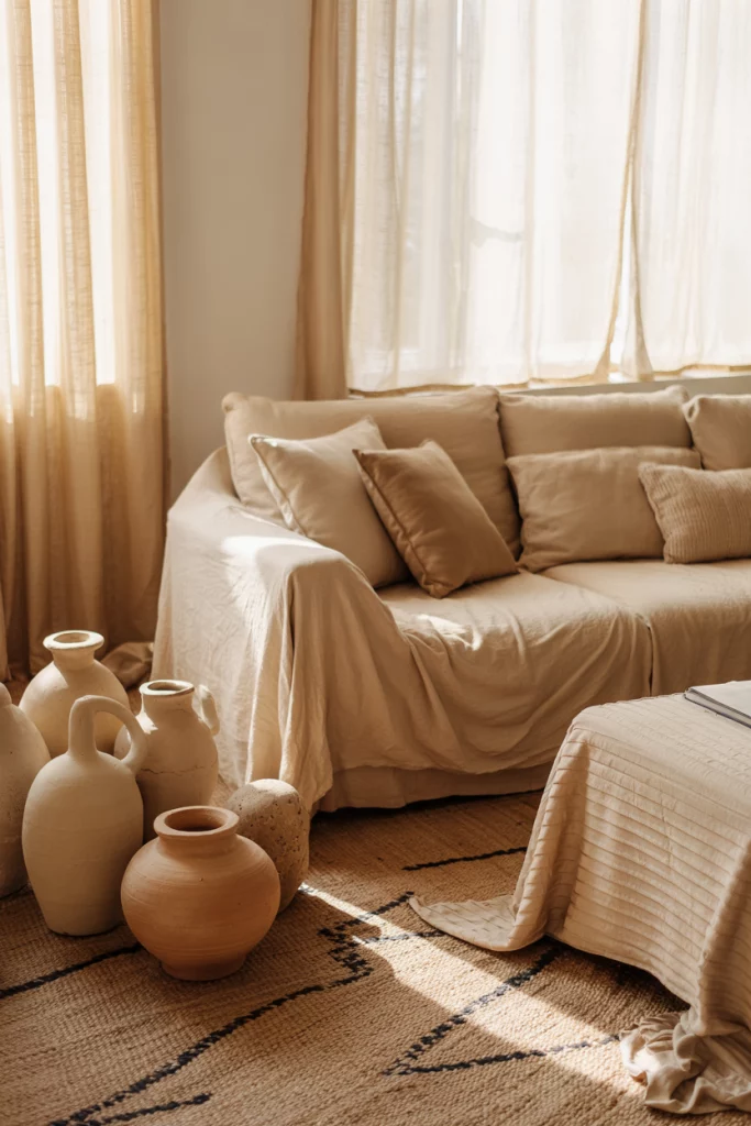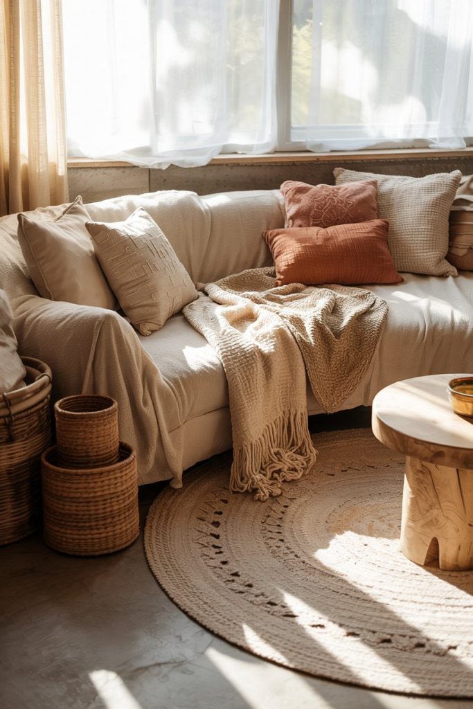 Think of decor in earth tones blending seamlessly with organic fabrics like linen, wool, and clay ceramics. The palette is rooted in warm neutrals, perfect for those seeking calm yet tactile spaces. Adding soft curtains and a woven rug enhances the cozy mood while keeping the room grounded in nature.