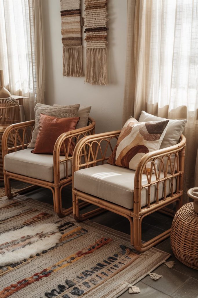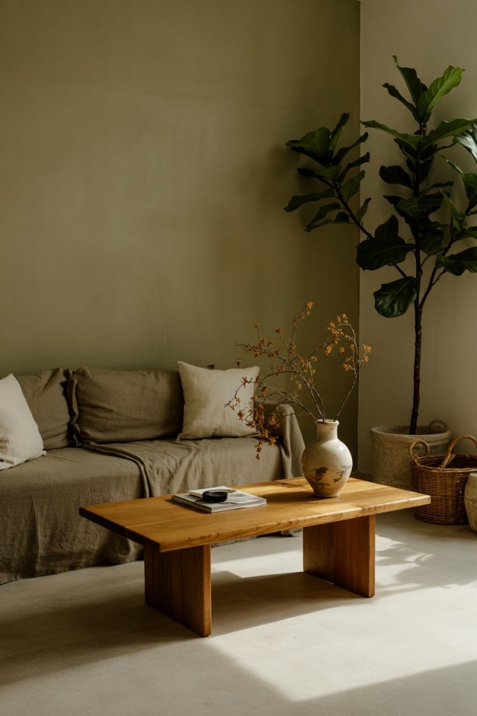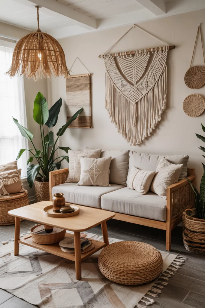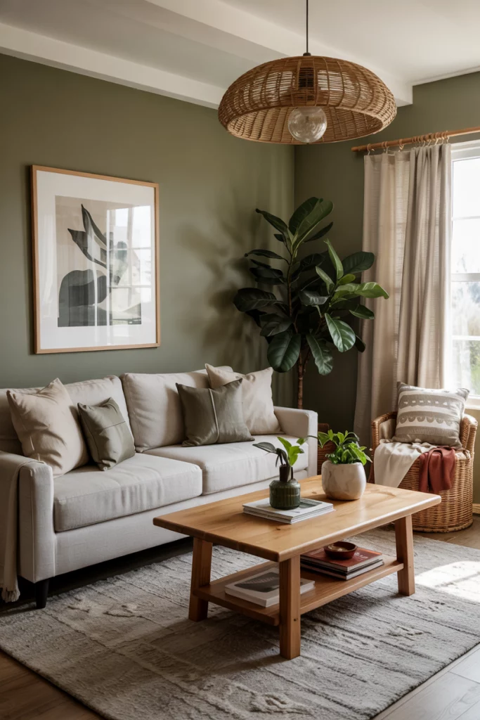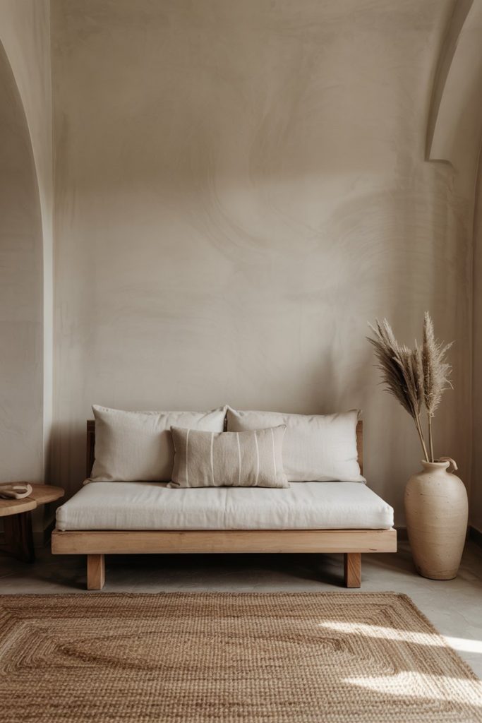 Think of decor in earth tones blending seamlessly with organic fabrics like linen, wool, and clay ceramics. The palette is rooted in warm neutrals, perfect for those seeking calm yet tactile spaces. Adding soft curtains and a woven rug enhances the cozy mood while keeping the room grounded in nature.