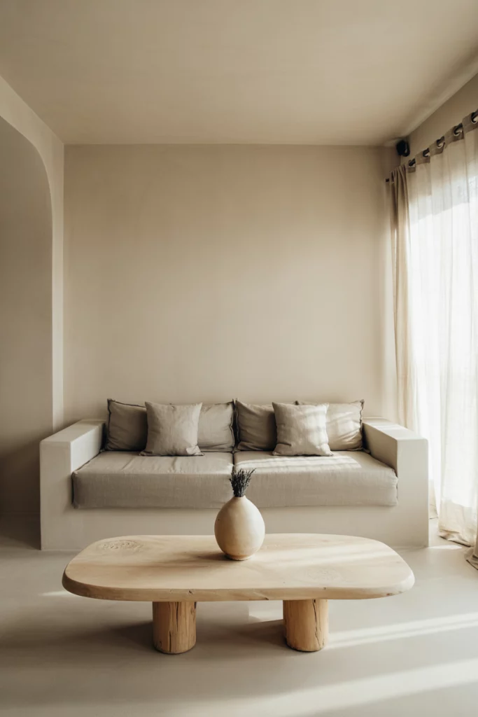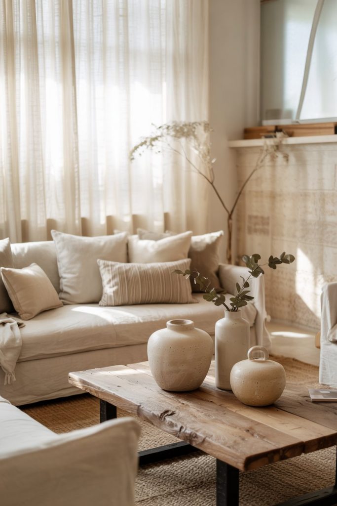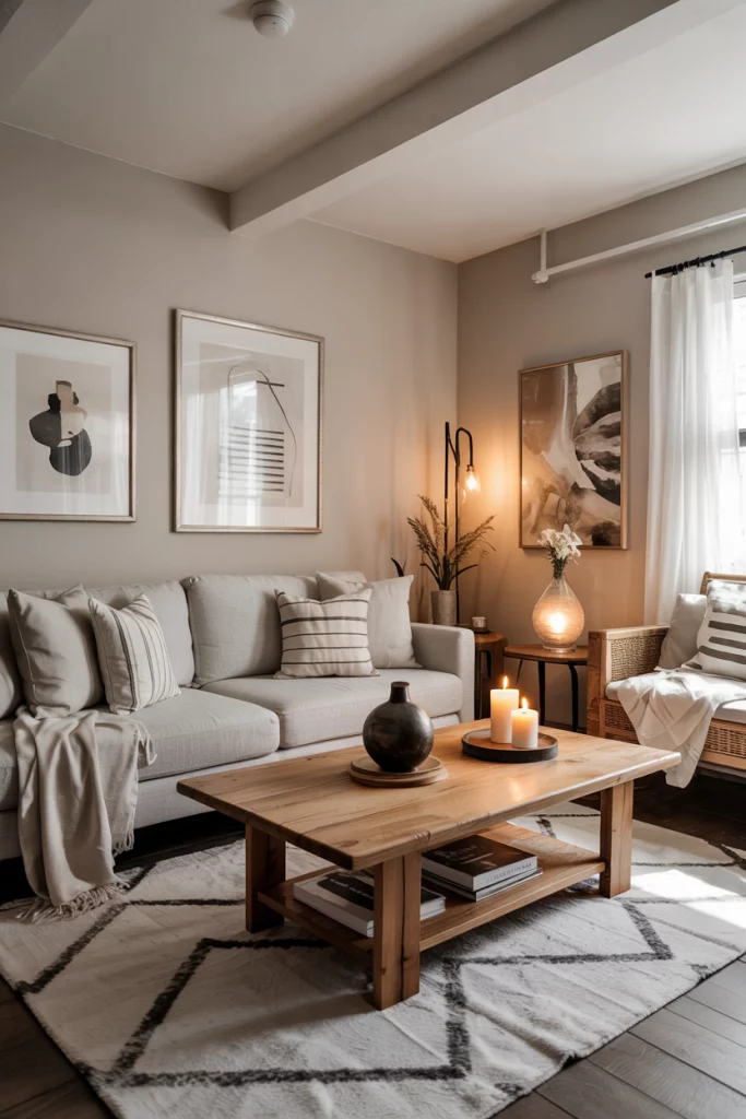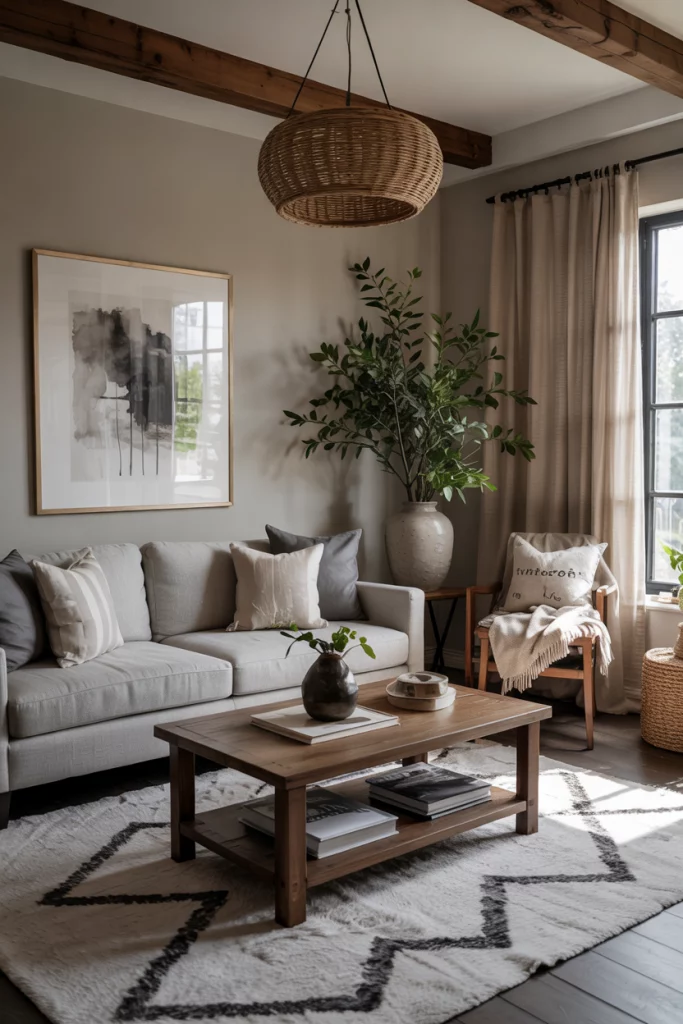 Rustic doesn’t mean rough. It evokes soft-lit spaces with reclaimed wood, stone accents, and linen curtains. This idea combines countryside warmth and modern sensibility, perfect for those wanting their neutral living room to feel soulful and lived in.