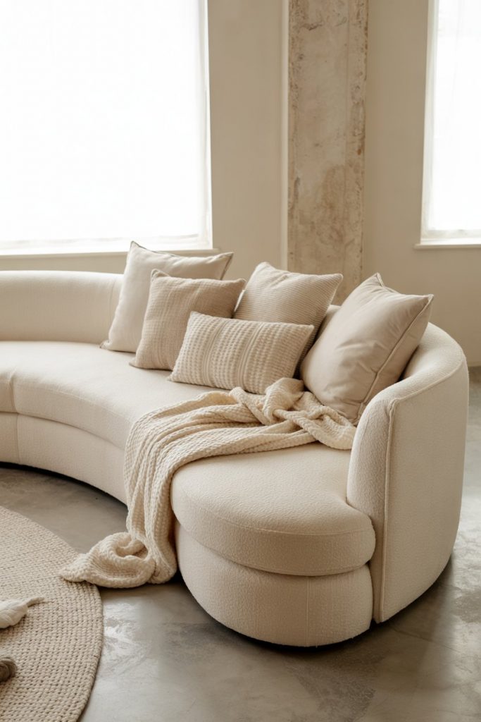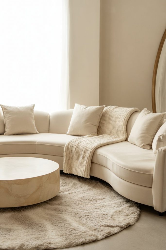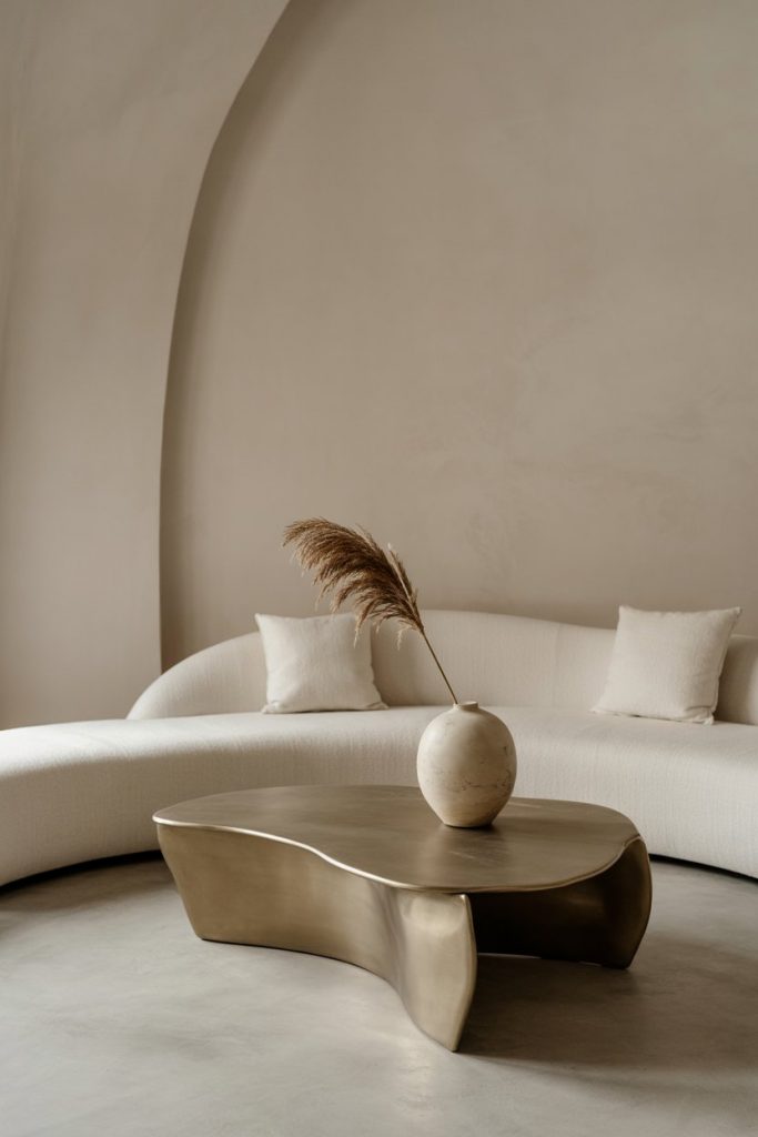 Curved, modern furniture doubles as art. A rounded sofa or asymmetrical coffee table keeps the neutral palette interesting. Designers like Kelly Wearstler emphasize form as function—proof that decor can be both sculptural and livable.