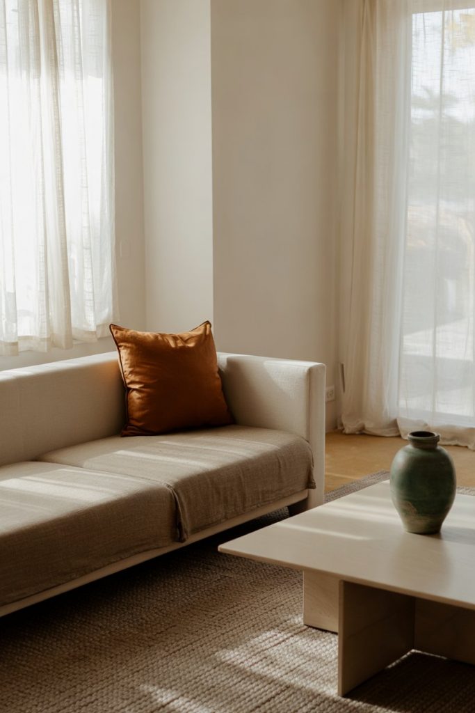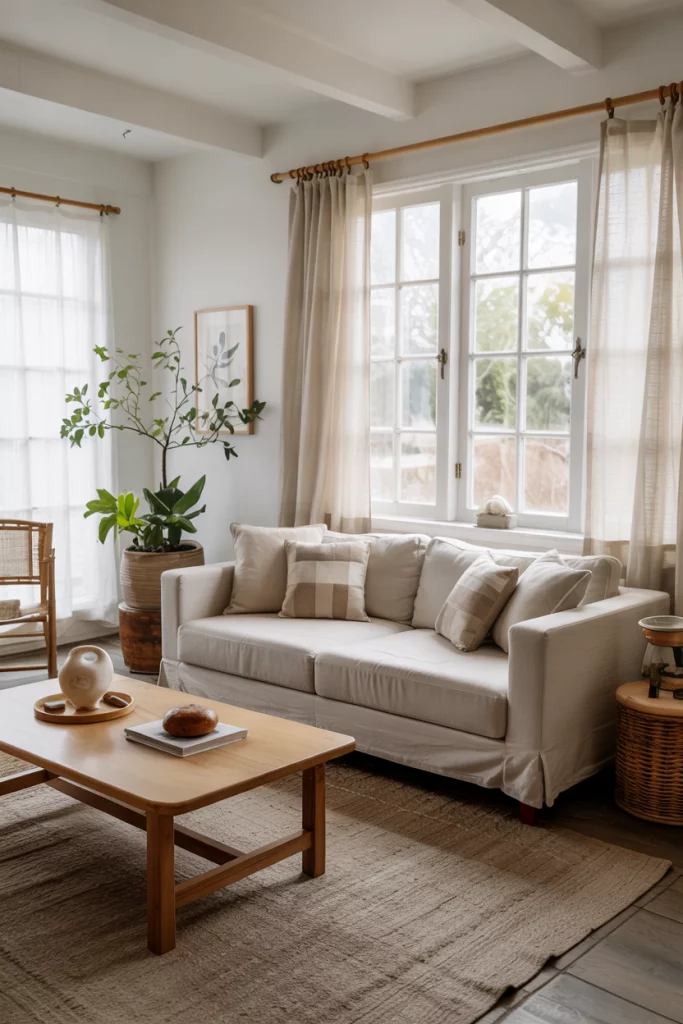 A bright, earthy space starts with openness. Sheer curtains, wide windows, and natural materials invite warmth. Position seating to follow light flow—it transforms the mood instantly. This idea evokes tranquility through simplicity.