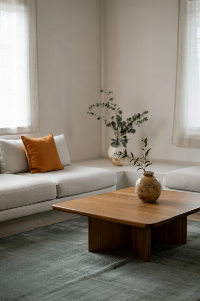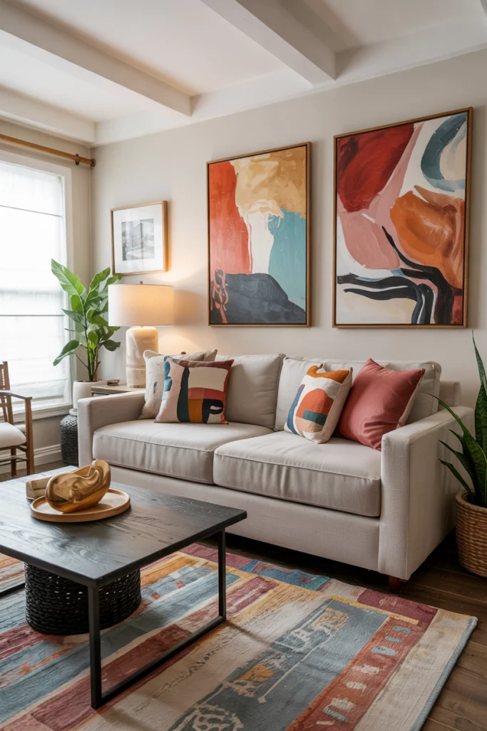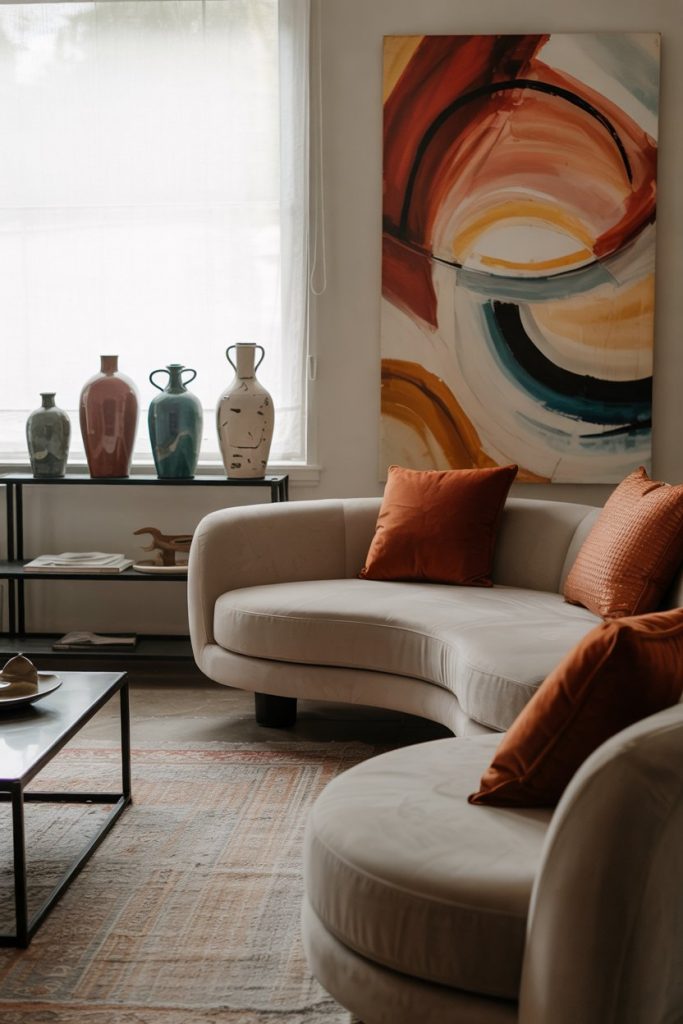 A pop of color in a neutral living room keeps the design dynamic. Try adding color through artwork, pottery, or textiles rather than walls. A coral painting or teal vase can bring life to a minimalist room, showing personality without breaking its calm harmony.