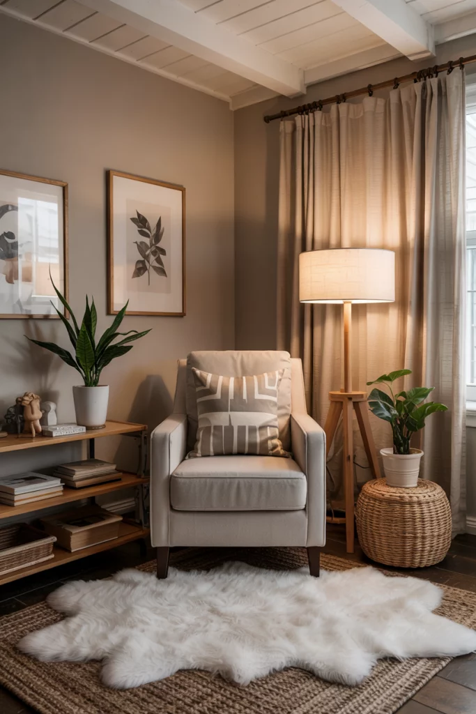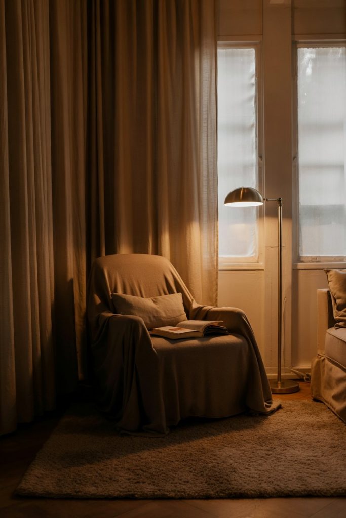 Create intimacy by styling a cozy reading corner. A plush armchair, soft rug, and curtains that filter daylight make it irresistible. Add a slim floor lamp for moody evenings—perfect for curling up with your favorite design magazine.
