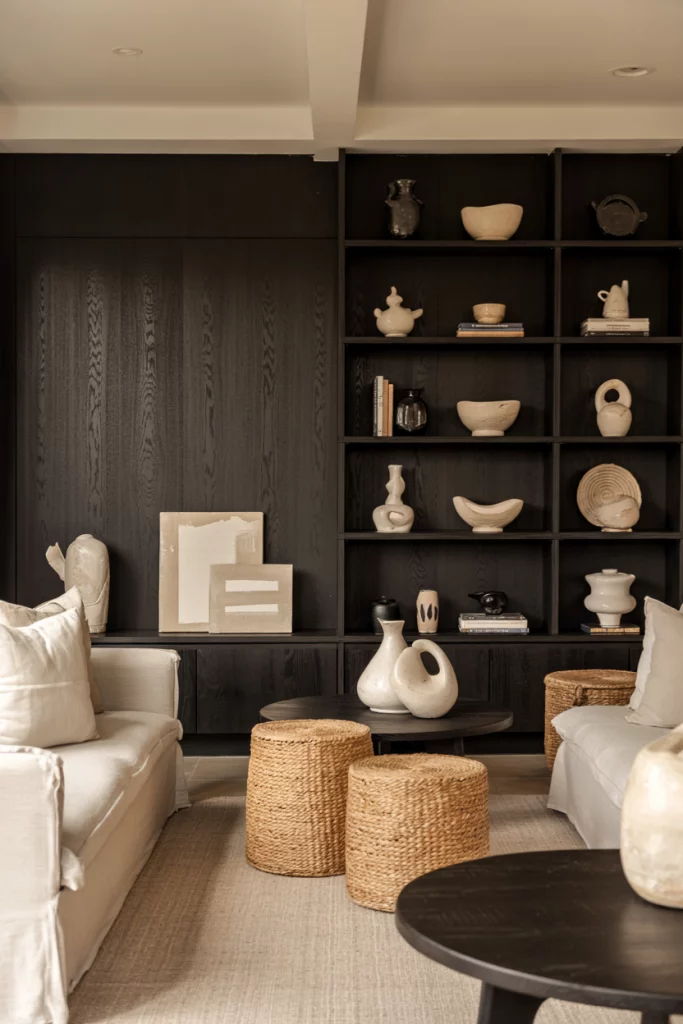 A black and natural palette feels grounded and confident. Use dark oak shelves, woven baskets, and black accents like lamp bases for balance. The contrast of dark and light tones creates structure in an otherwise soft decor scheme.