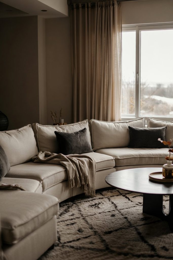 In 2026, moody neutrals are key for creating drama without color chaos. Think charcoal, taupe, and cream tones layered with tactile rug textures. Soft curtains and matte finishes provide a balanced look that feels both dark and serene.