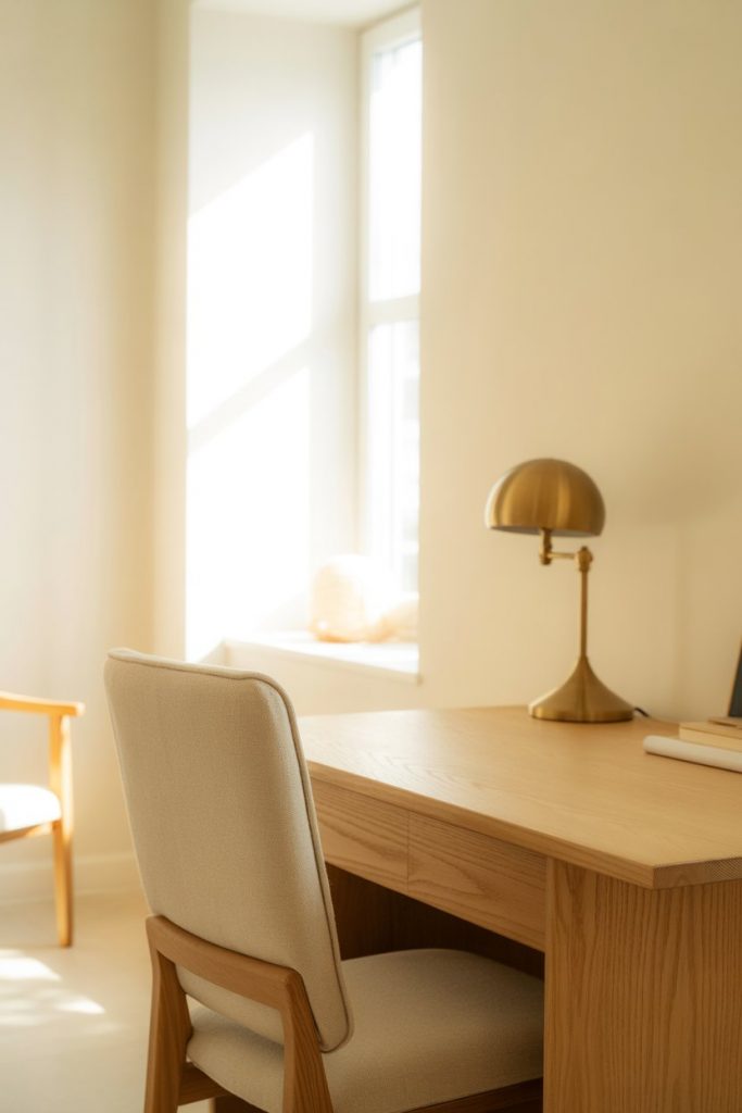 A professional modern workspace doesn’t have to feel sterile. Instead, consider a setup that uses warm wood tones, soft neutral fabrics, and layered lighting to create a calming yet focused environment. This works especially well for professional women and men who want a refined look without sacrificing comfort. Choose a clean-lined desk paired with a linen upholstered chair, and add a small brass lamp for task lighting that feels intentional and elevated.