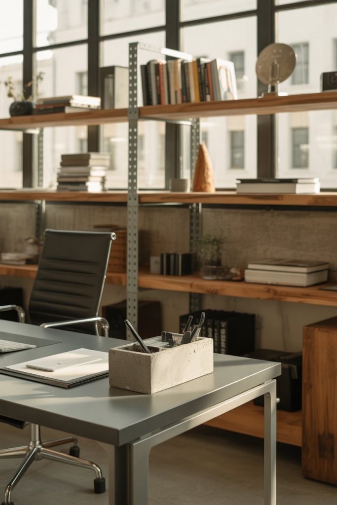 An industrial-style workspace uses raw materials like metal, concrete, and reclaimed wood to create a bold, urban feel. Think a steel-framed desk, exposed shelving, and a concrete desktop organizer. This look is especially popular among professional men in creative fields like architecture and design who want their office to feel edgy and purposeful without being overly decorated.