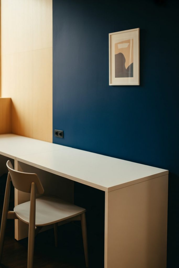A single painted wall in a rich color—navy, forest green, or charcoal—can instantly elevate a simple desk setup. This works especially well if your workspace is in a corner or alcove where the accent wall frames the desk like a backdrop. Pair the bold color with light furniture and minimal accessories to let the wall do the talking. It’s a favorite trick among business owners who want their Zoom backgrounds to look polished and professional.