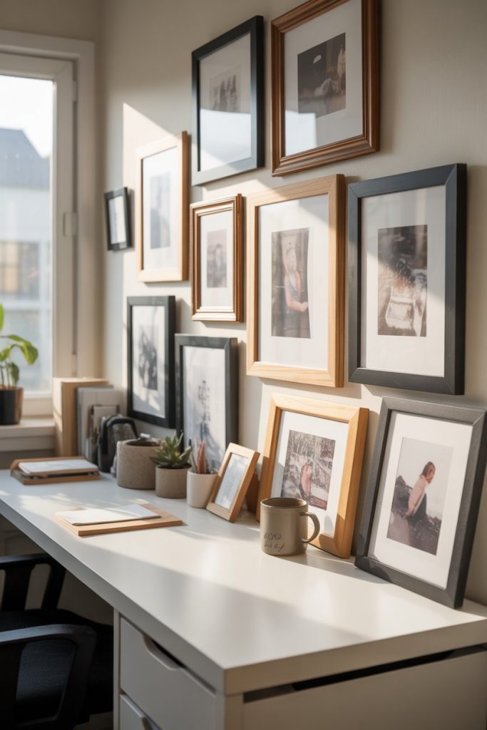 A curated gallery wall behind your desk adds personality and visual interest without taking up desk space. Mix frame sizes and styles—black, brass, natural wood—and include a combination of art prints, photos, and inspirational quotes. This is especially effective for professional women and men who work in creative fields and want their environment to reflect their interests and values.