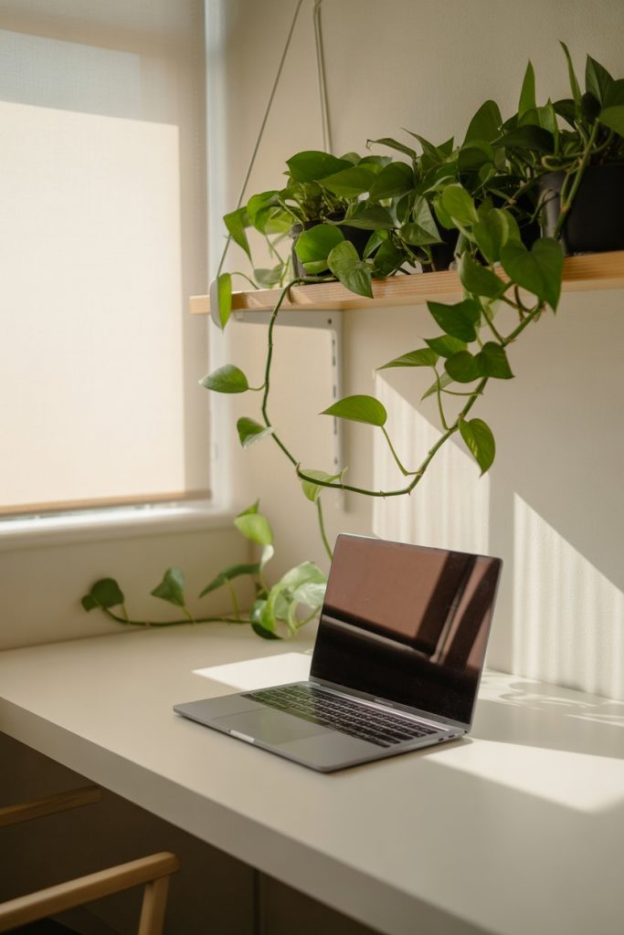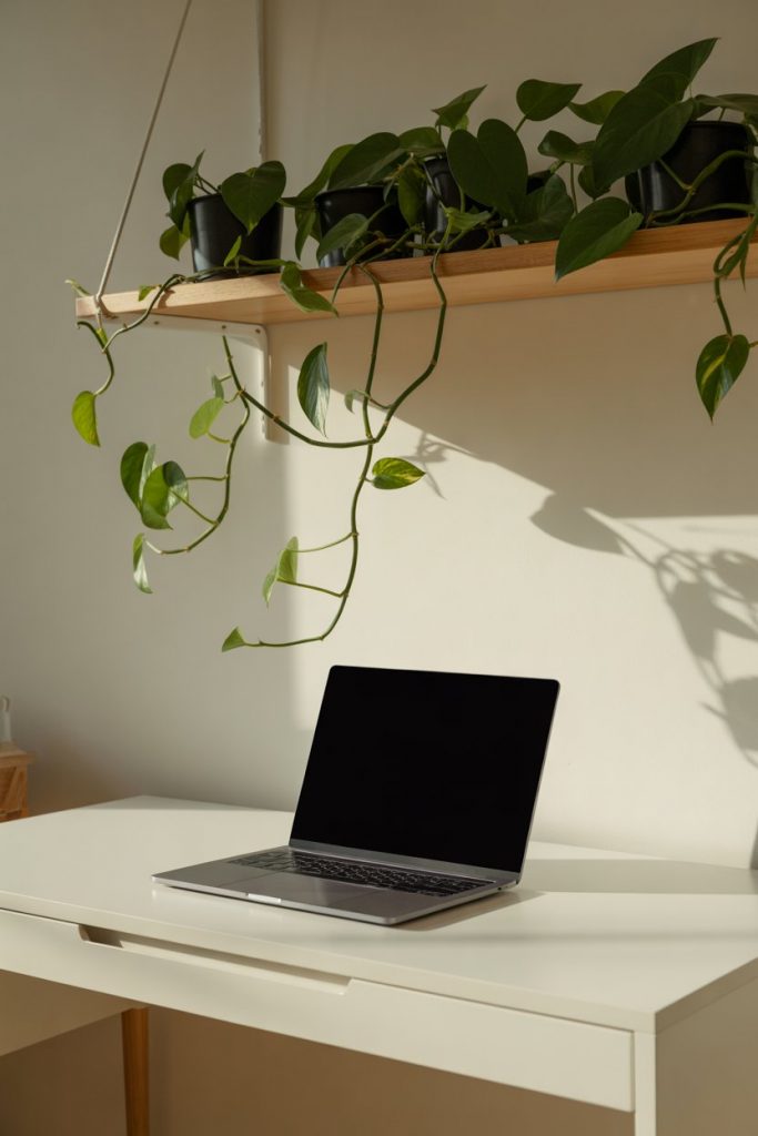 2. Greenery-Forward Desk Setup with Trailing Plants