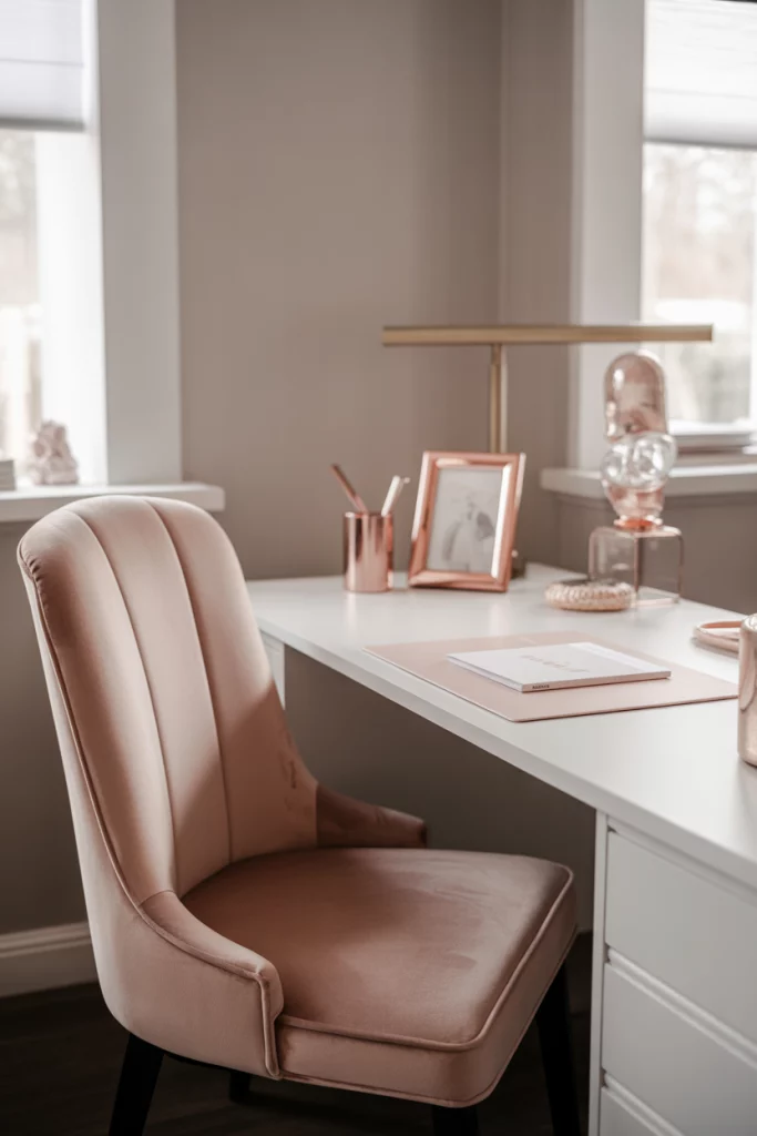 This setup works best in natural light. Position your desk near a window and let morning sun warm the blush tones. If your space lacks windows, use warm LED bulbs to avoid the clinical feel of cool white lighting, which can make soft colors look washed out.