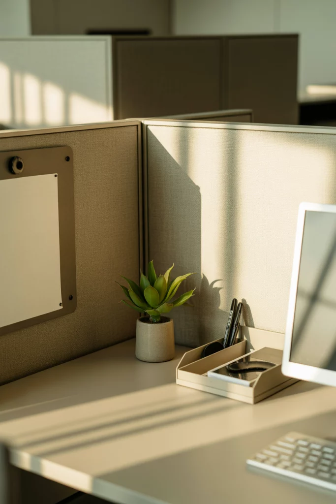 4. Compact Cubicle Refresh with Fabric Panels and Organizers