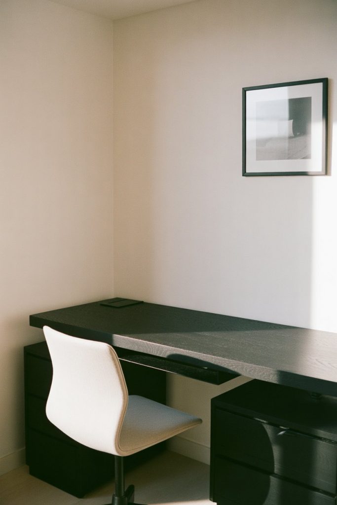 This approach works best in smaller home offices or studio apartments where visual simplicity prevents the space from feeling cramped. One common mistake is choosing furniture that’s too heavy or dark, which can make a small room feel cave-like. Balance black furniture with white walls and plenty of light to keep the energy lifted.