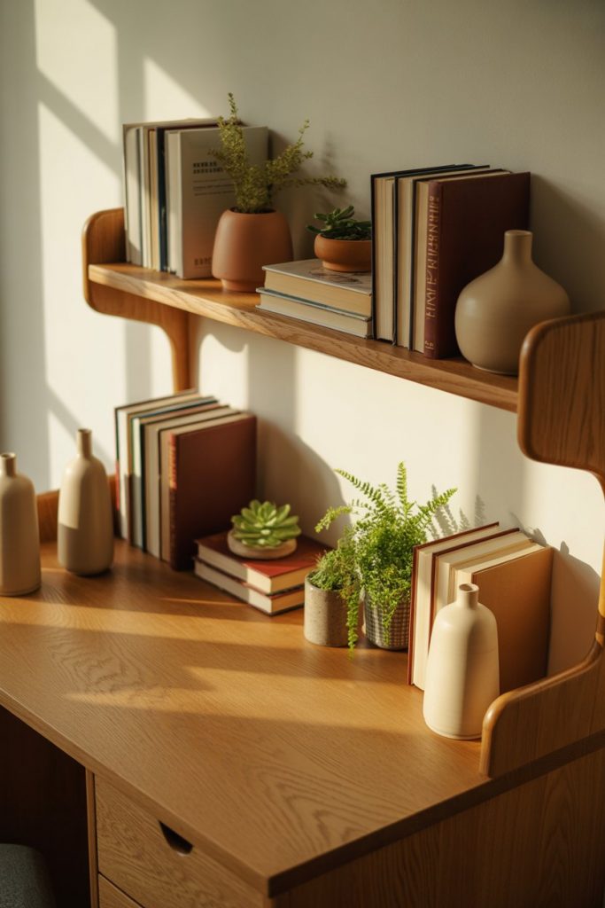 Open shelving paired with a solid wood desk creates a workspace that feels grounded and intentional. This style suits those who want to display books, ceramics, or framed photos while keeping the overall vibe warm and professional modern. Choose shelves in the same wood tone as your desk to create visual continuity, and style them with a mix of practical items and a few personal touches.