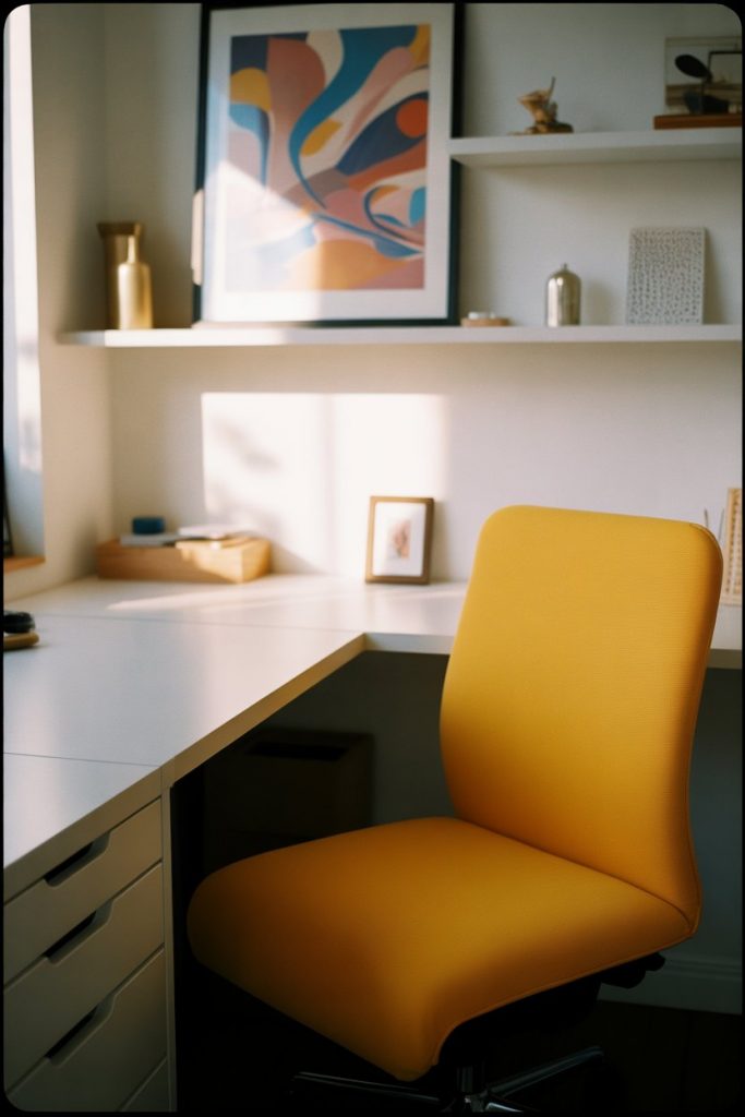 An all-white workspace feels fresh and expansive, especially when accented with small bursts of color. Consider a white desk and shelving, then introduce a bold chair in mustard, cobalt, or coral. Add a vibrant desk mat or a colorful print to tie the look together. This approach appeals to those who love a clean aesthetic but don’t want their office to feel too clinical or cold.
