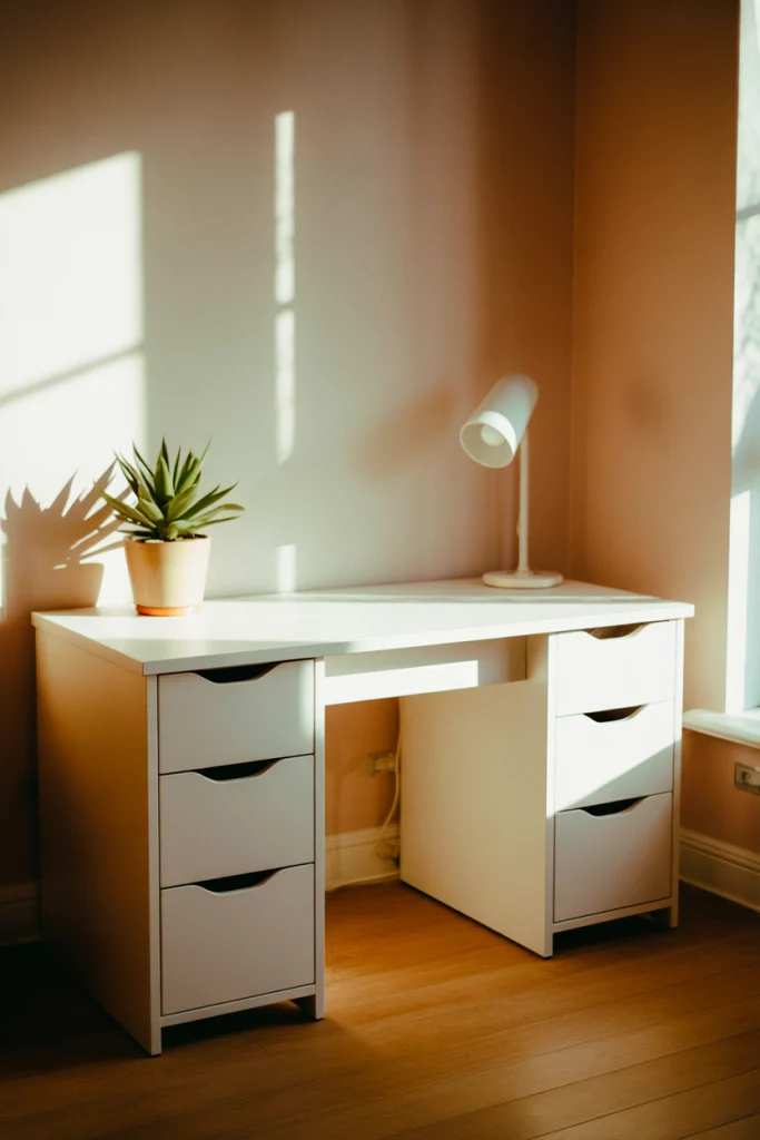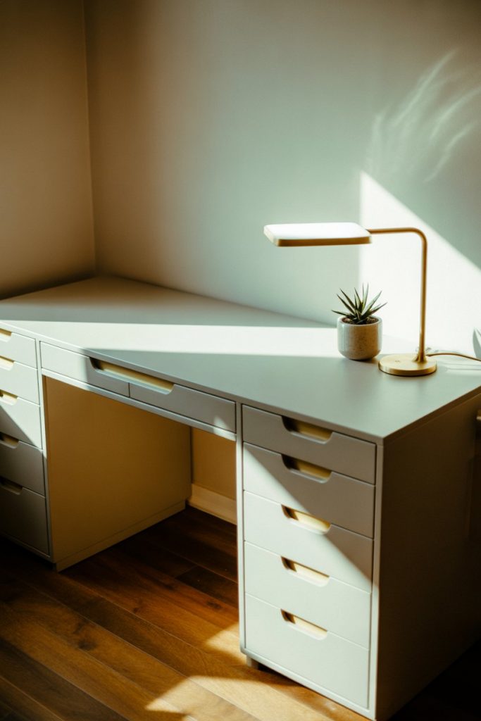 This setup works best in bedrooms or multipurpose spaces where the desk needs to blend seamlessly with existing furniture rather than dominate the room. The white surface also reflects light beautifully during morning work sessions, reducing the need for additional overhead lighting. If you’re concerned about keeping a white desk pristine, opt for a matte finish that hides fingerprints and minor scuffs better than glossy surfaces, and keep a microfiber cloth handy for quick daily wipes.